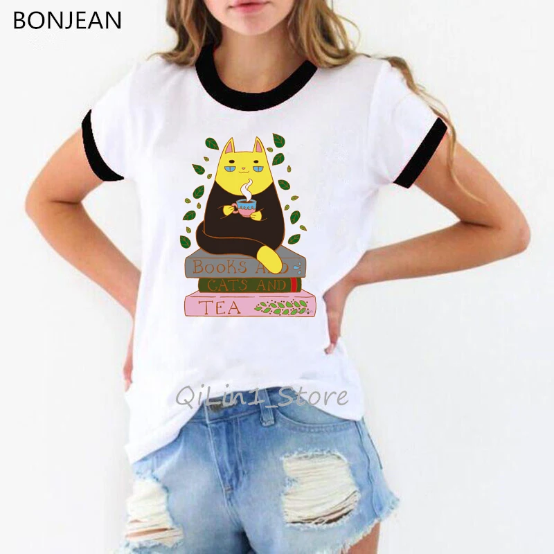 Футболка с принтом I Love Book And Cat, винтажная забавная футболка с мультяшным принтом, летний модный женский топ с коротким рукавом, хипстерские футболки, футболки для девочек