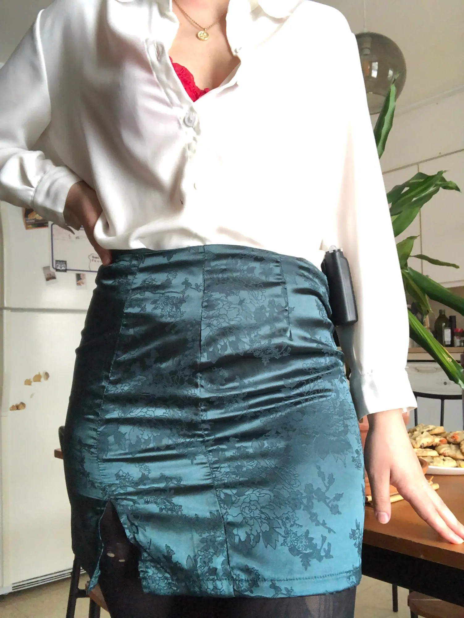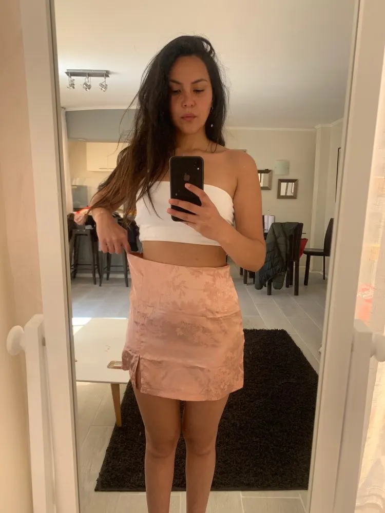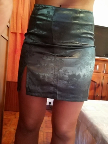 Юбка выглядит как на изображении, была немного большой, я обычно маленький и заказал один, и его нужно будет отрегулировать, возможно, размер вниз, если вы хотите облегающую юбку