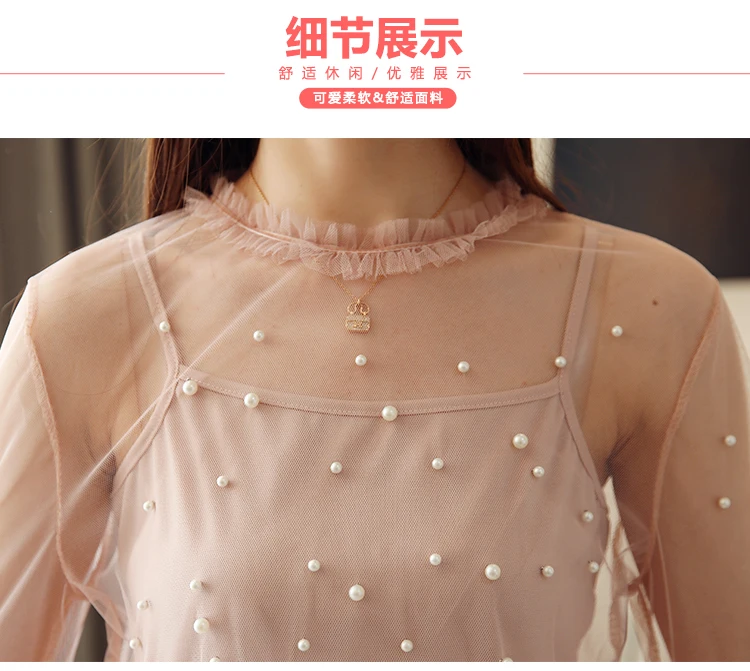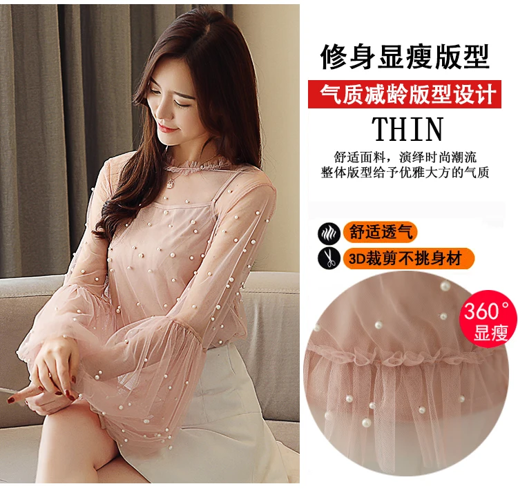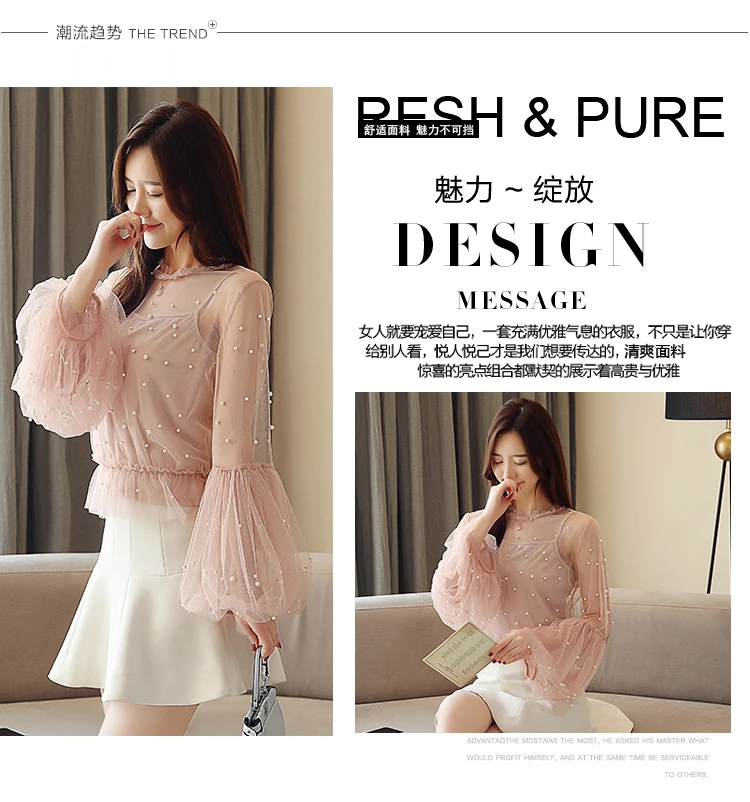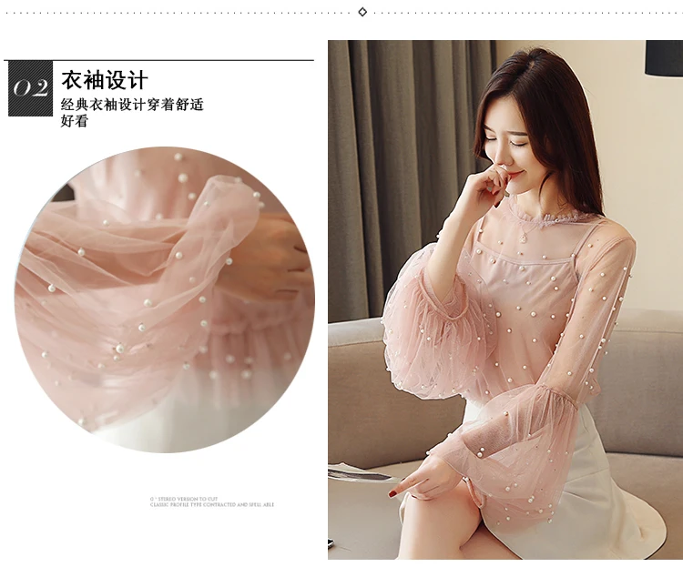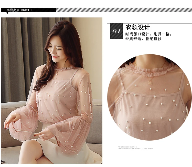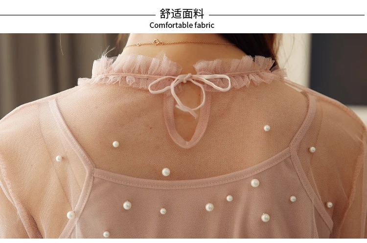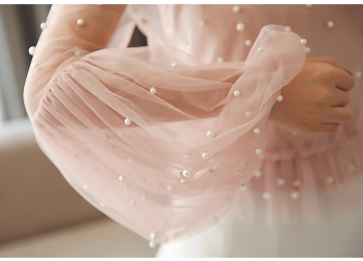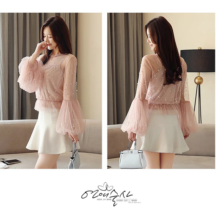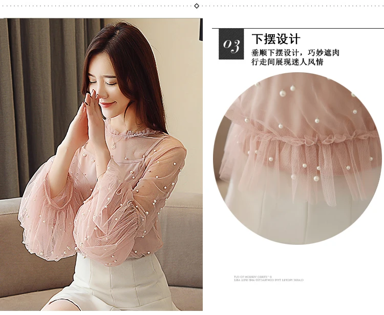Женская прозрачная сетчатая блузка, прозрачная блузка с пышными длинными рукавами, модная прозрачная белая рубашка с жемчугом, Осенние Топы