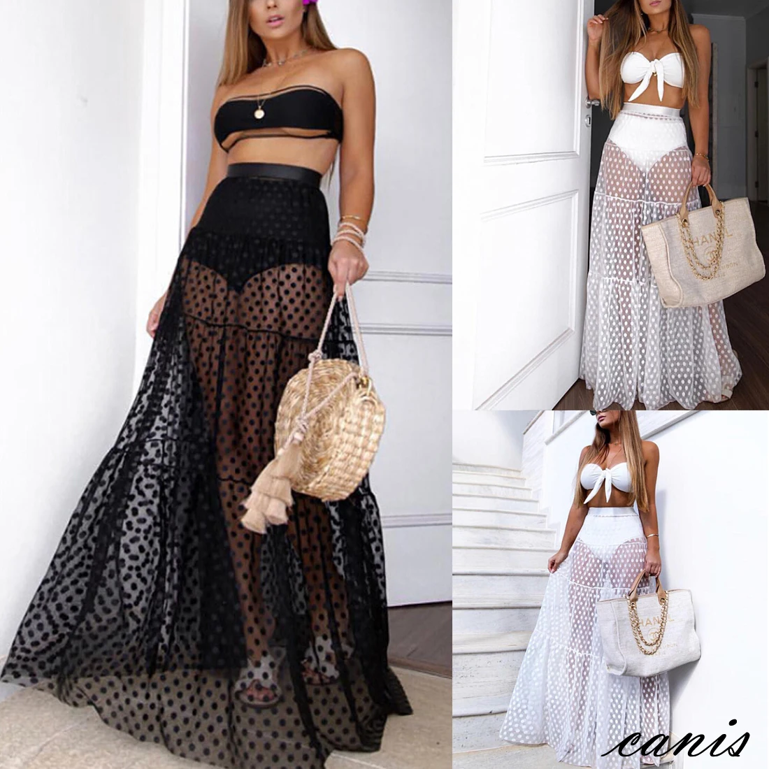 Новые летние Для женщин из сетки в горошек прозрачная юбка макси Об...