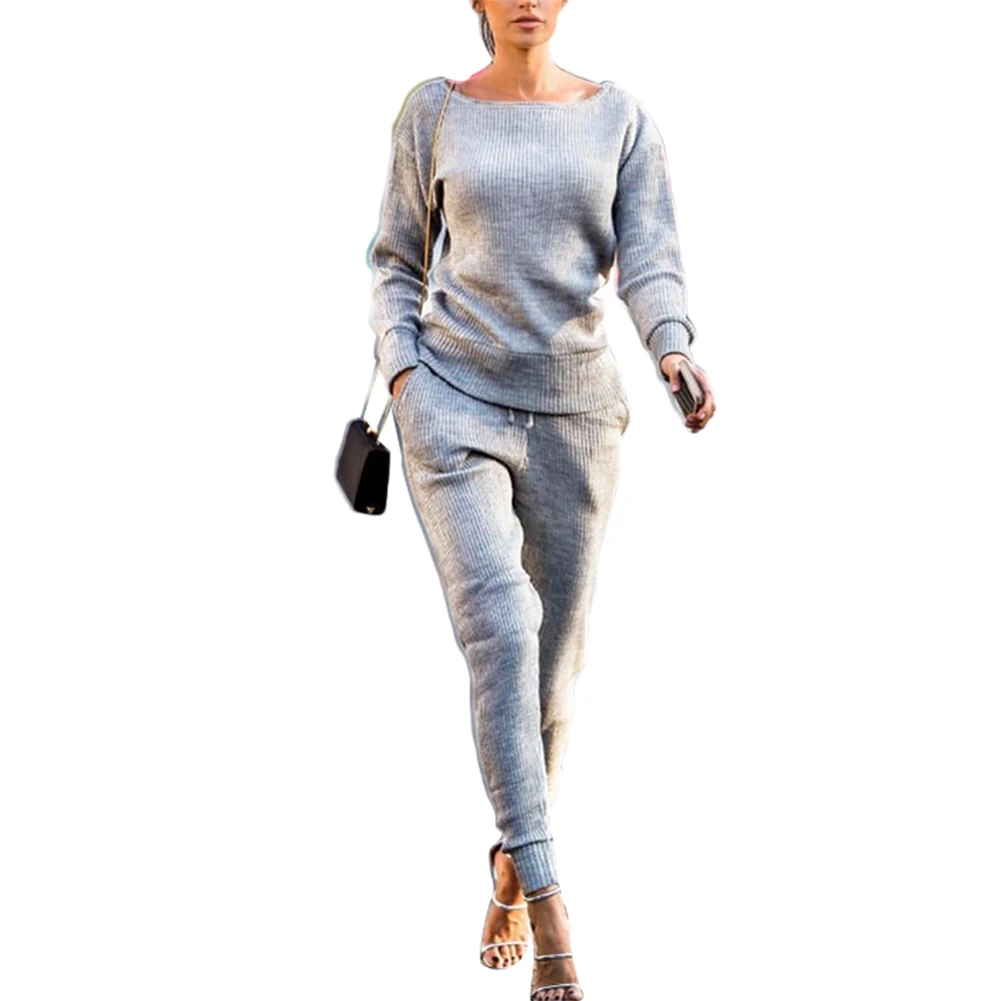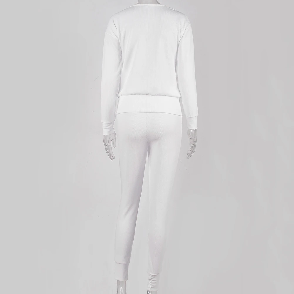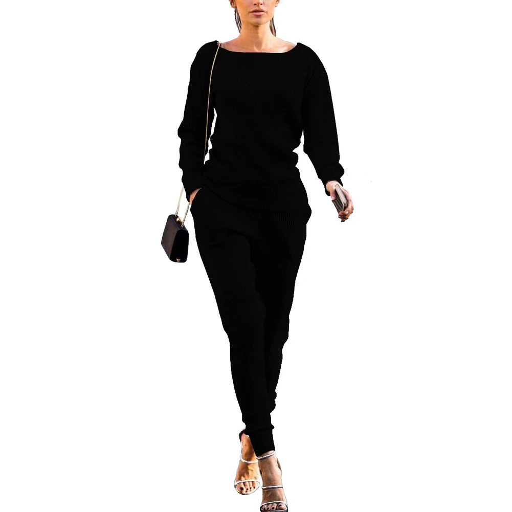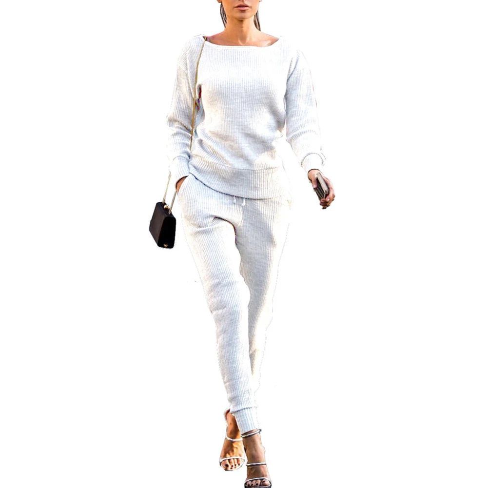 Спортивный костюм женский, осенний, однотонный, в рубчик, с круглым вырезом