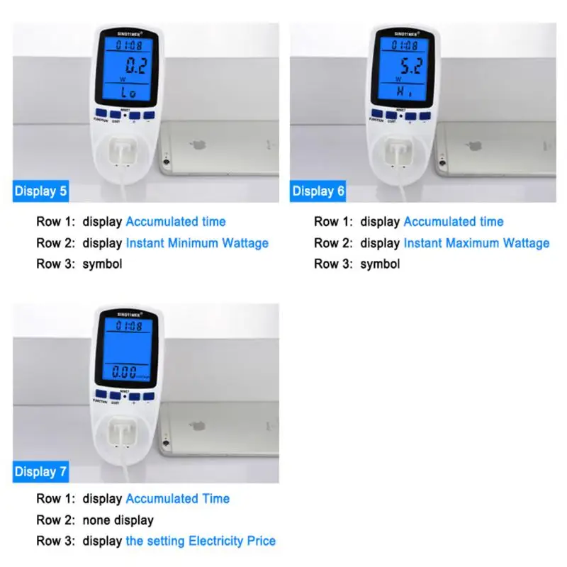 11. Измерение различных параметров + функция защиты от перегрузки: Мощность (Вт), энергия (кВтч), вольт, ампер, герц, коэффициент мощности и Максимальная мощность (Вт), время, дней (заряд электроэнергии в основном зависит от кВт · ч)