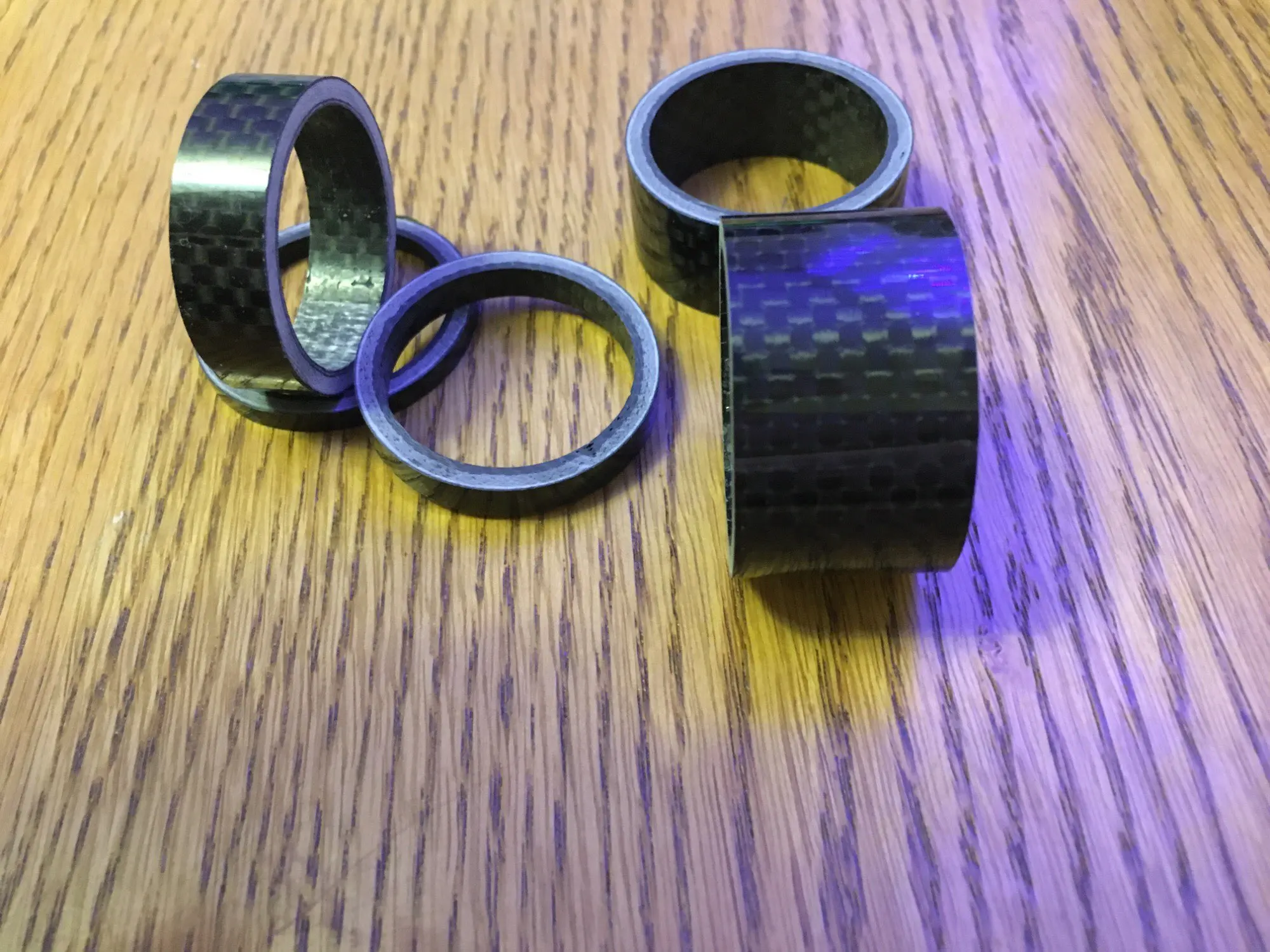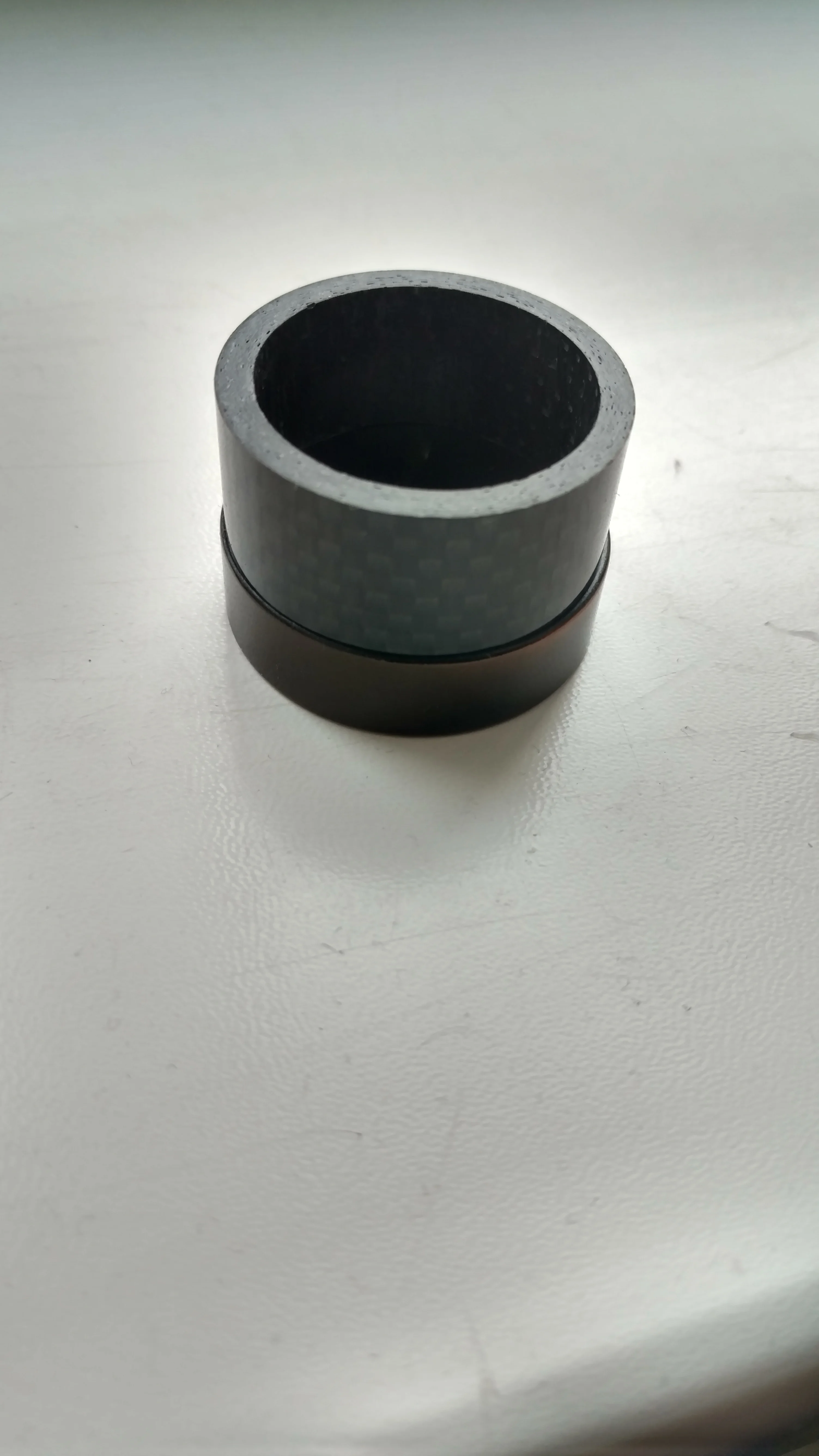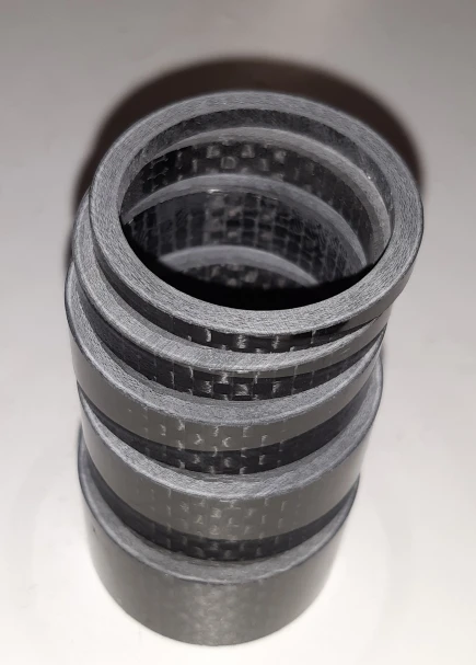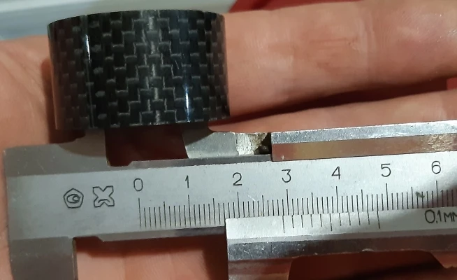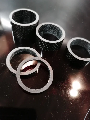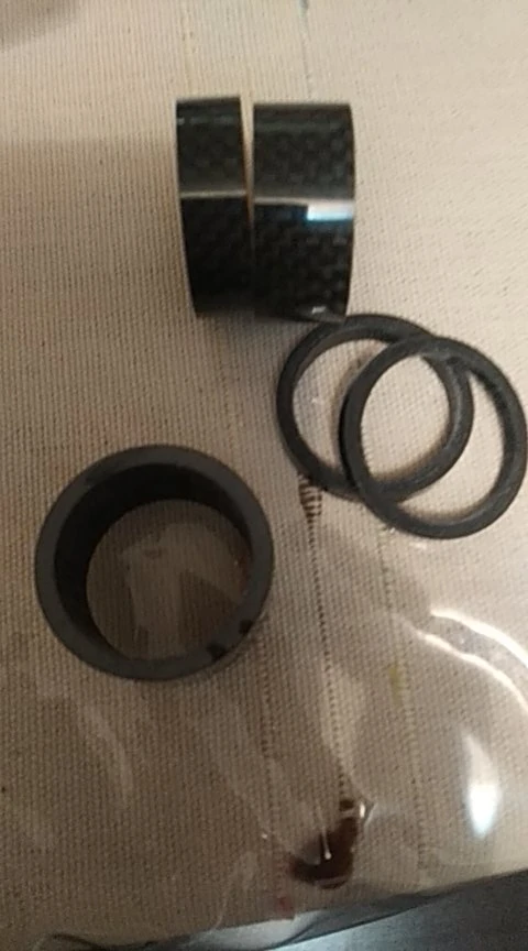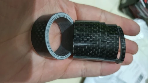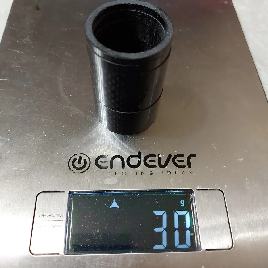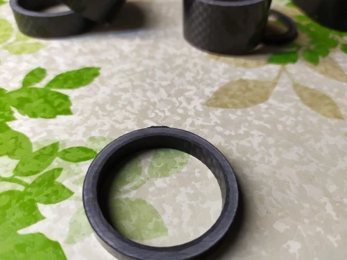 Кольца карбоновые. Внешняя сторона глянцевая. Структура плотная, без полостей. Торцы ровные. Внутренний диаметр колец 29 мм, толщина стенок - 3 мм. Внутренняя часть колец отделана лицевой стороной углеродной ткани. Лишь два огреха: на одном кольце есть недочëт в виде недопиленного внешнего слоя лака, на другом то ли царапина, то ли какой-то стык. Возможно, я придираюсь. Качество в целом высокое, видал немного хуже. Трек полностью отслеживается. Дошло быстро, не более трëх недель.
