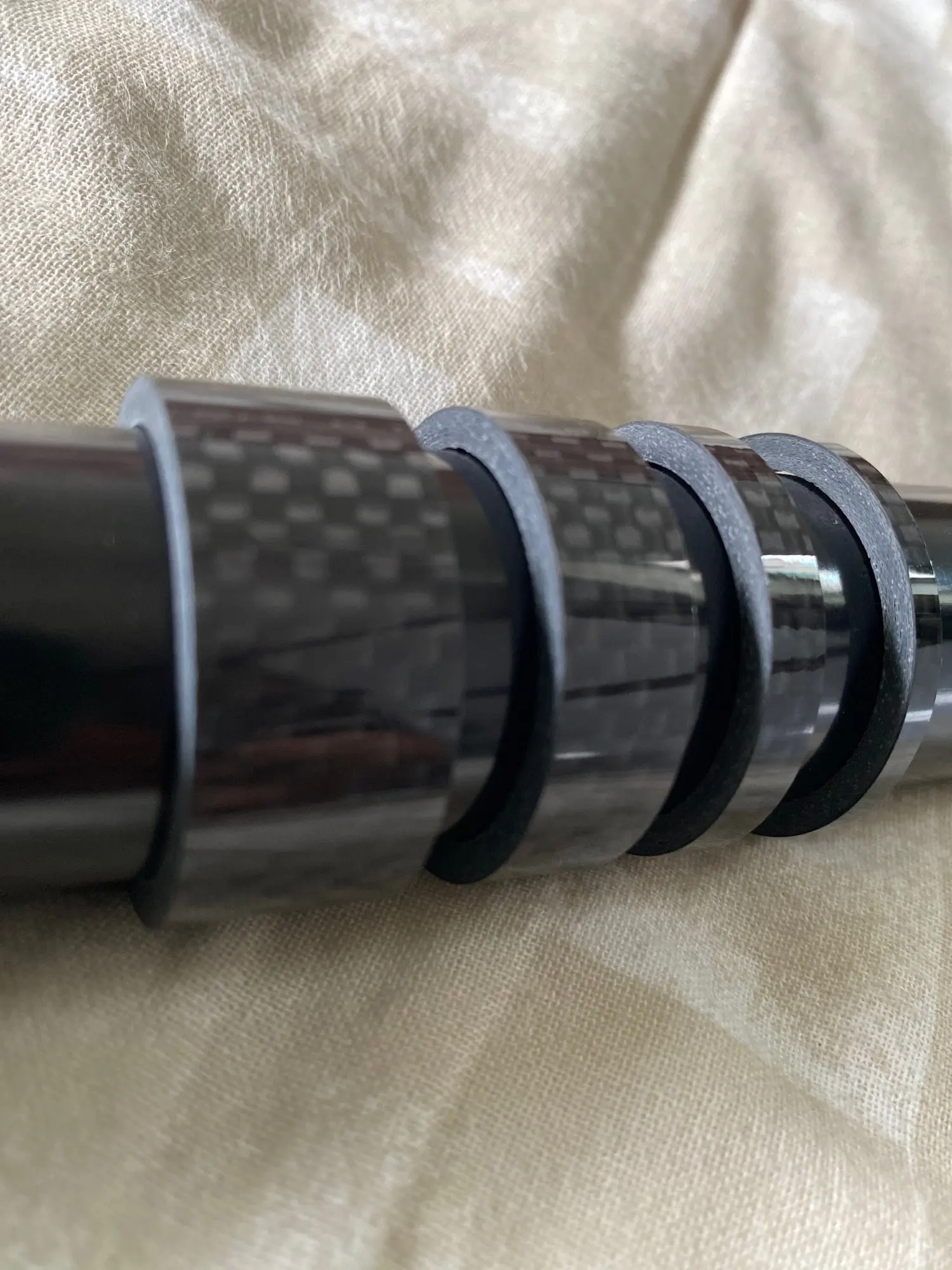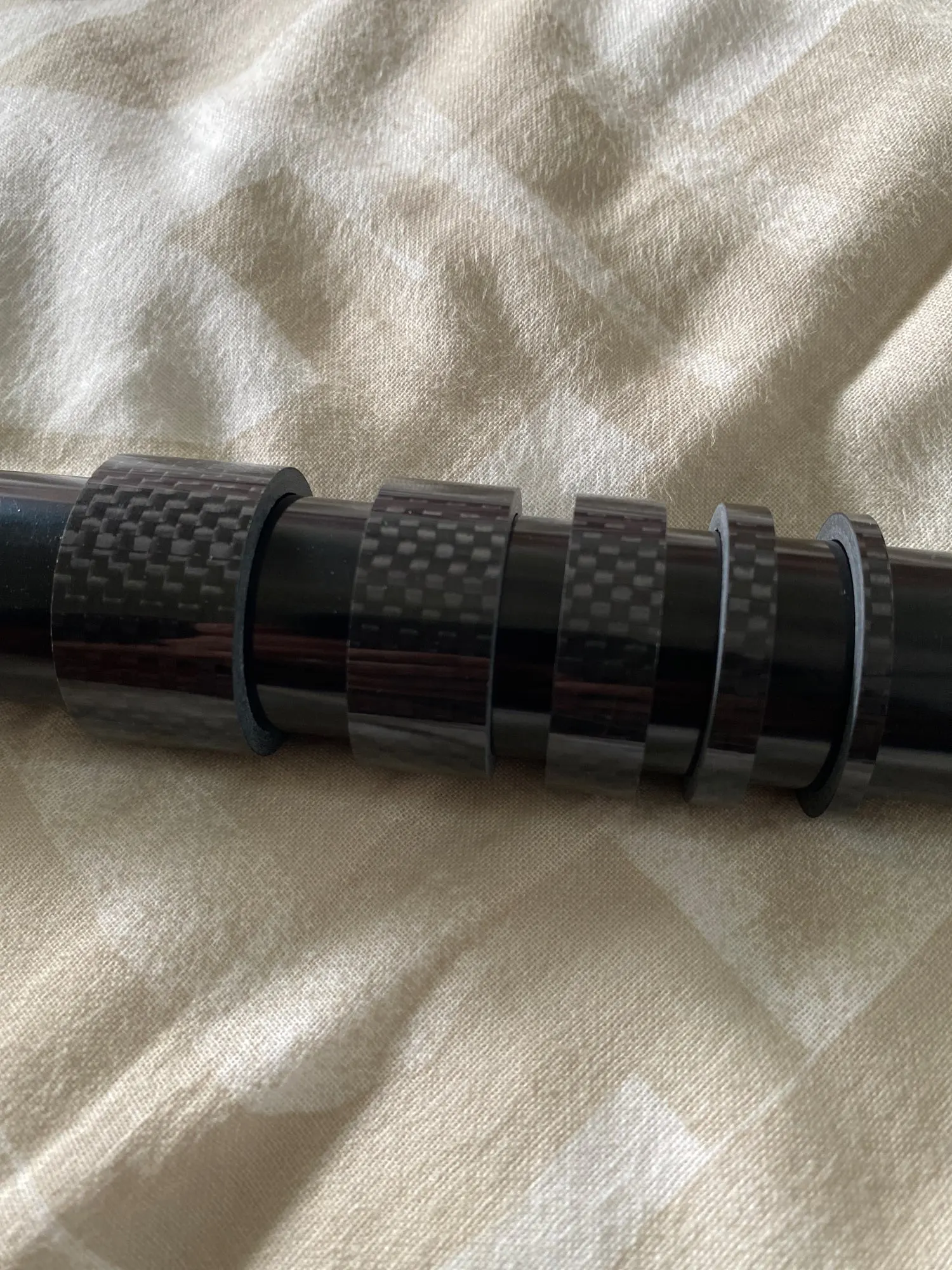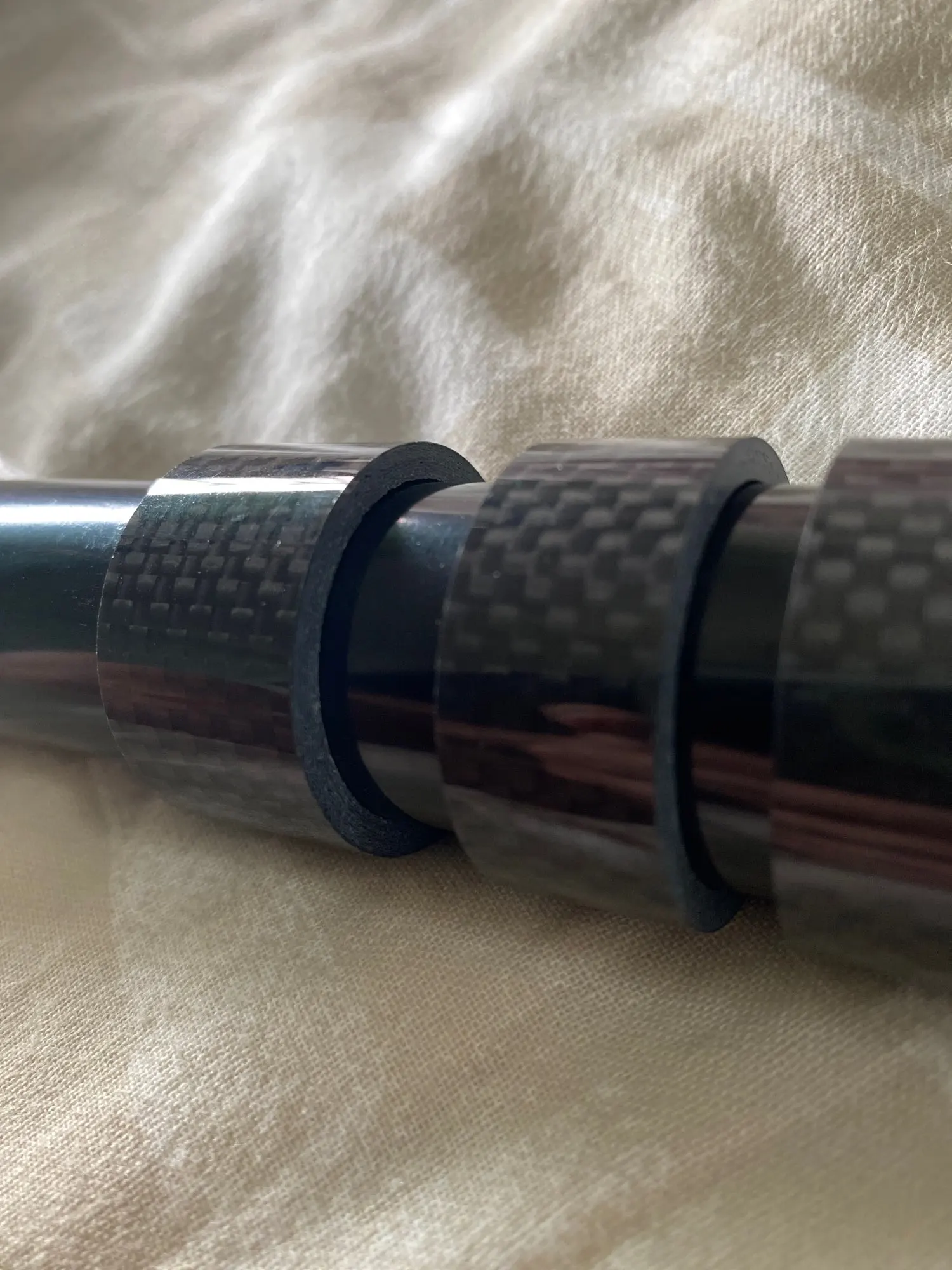 Кольца карбоновые. Внешняя сторона глянцевая. Структура плотная, без полостей. Торцы ровные. Внутренний диаметр колец 29 мм, толщина стенок - 3 мм. Внутренняя часть колец отделана лицевой стороной углеродной ткани. Лишь два огреха: на одном кольце есть недочëт в виде недопиленного внешнего слоя лака, на другом то ли царапина, то ли какой-то стык. Возможно, я придираюсь. Качество в целом высокое, видал немного хуже. Трек полностью отслеживается. Дошло быстро, не более трëх недель.