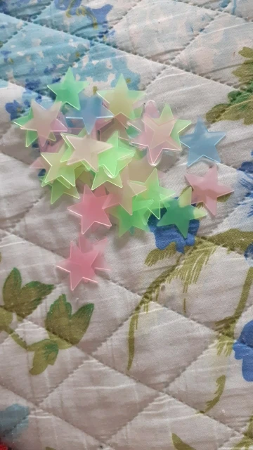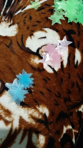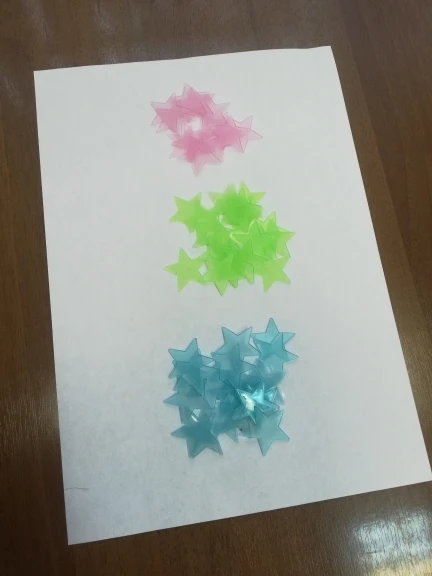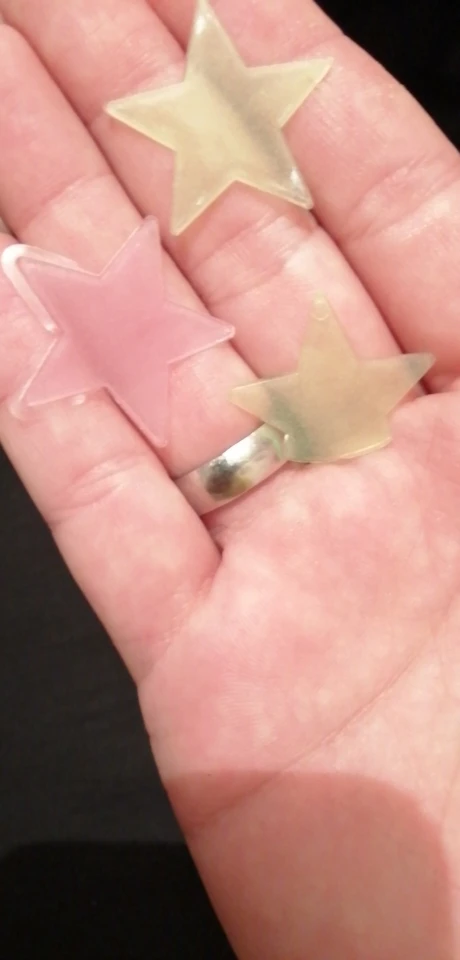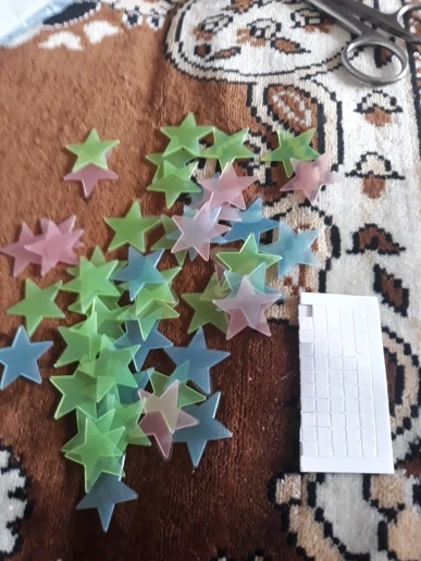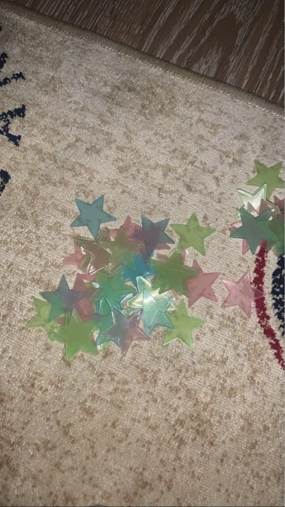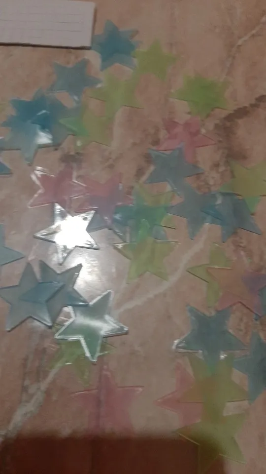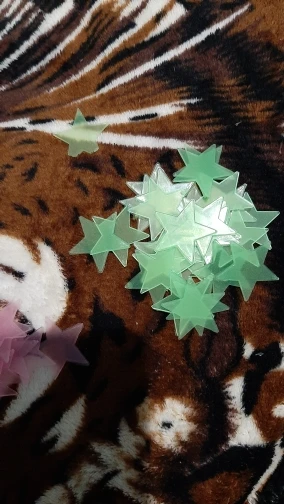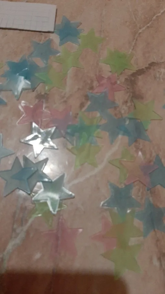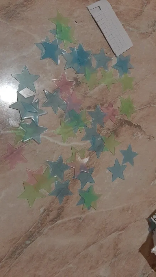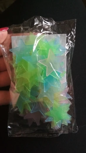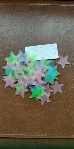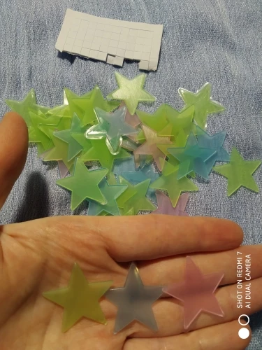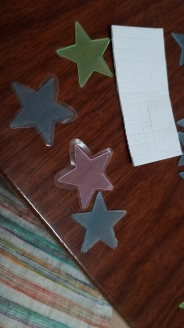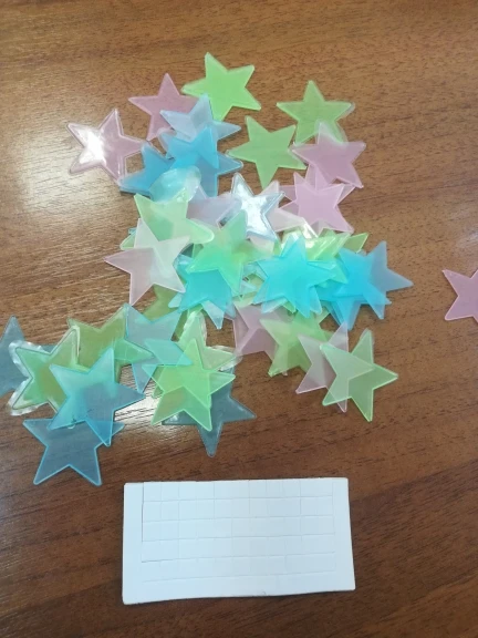 звёздочки просто супер. полупрозрачные и небольшие. пришло 53 штуки и совственно те самые липучки для них некоторые немного дефектные но это легко обрезать