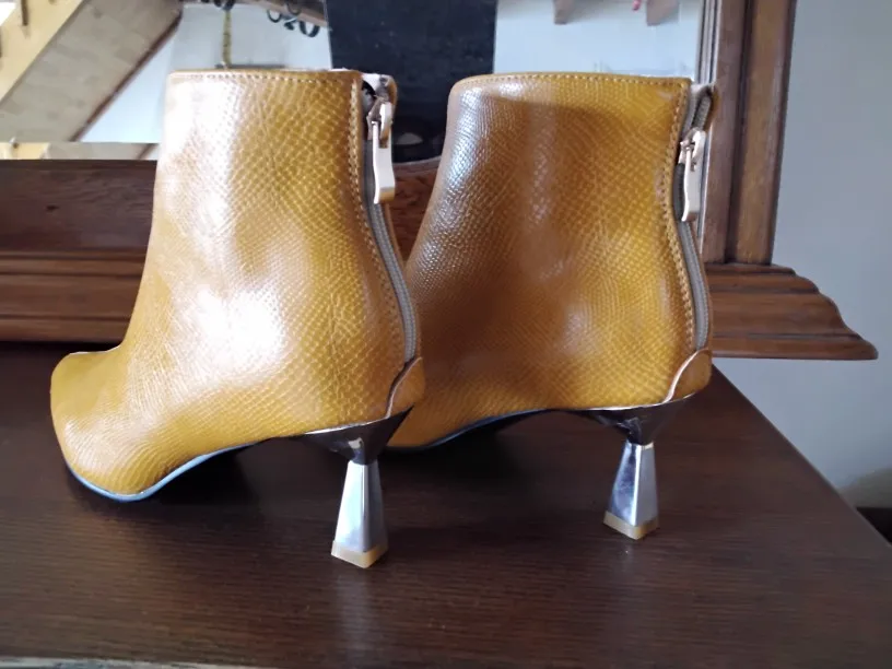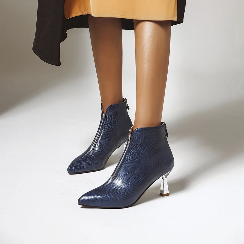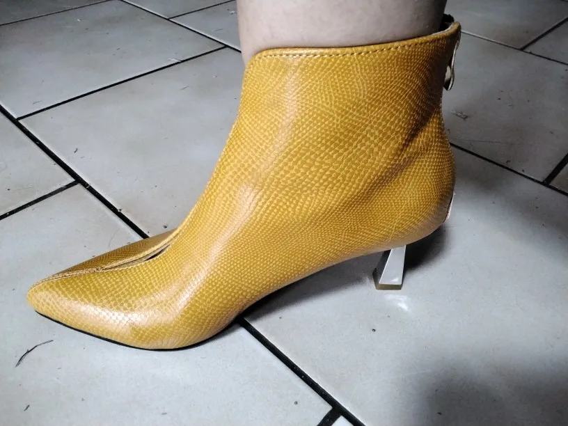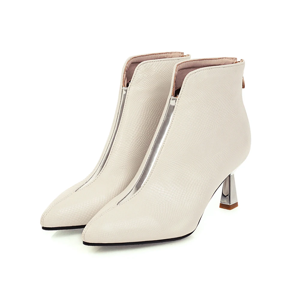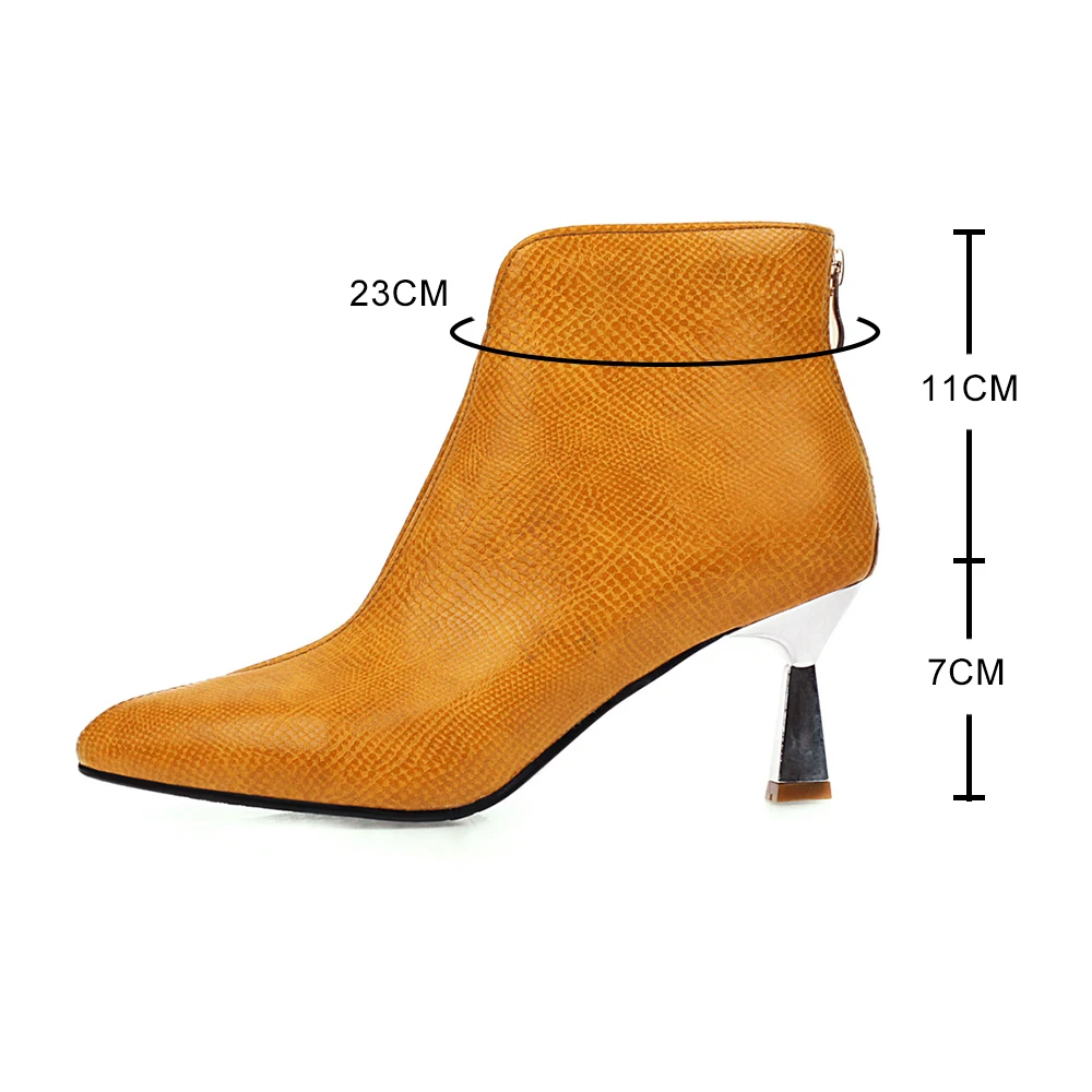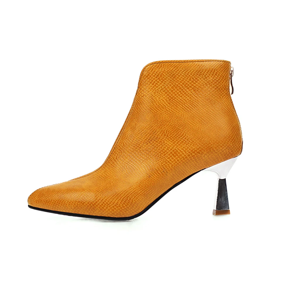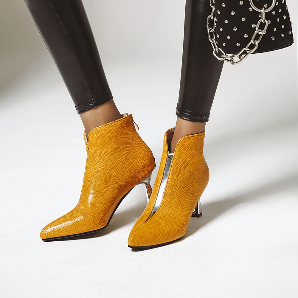 Большие размеры 41, 42, 43, пикантные женские ботильоны, модные сапоги со змеиным узором на высоком каблуке Женская Весенняя обувь на молнии желтого и белого цвета