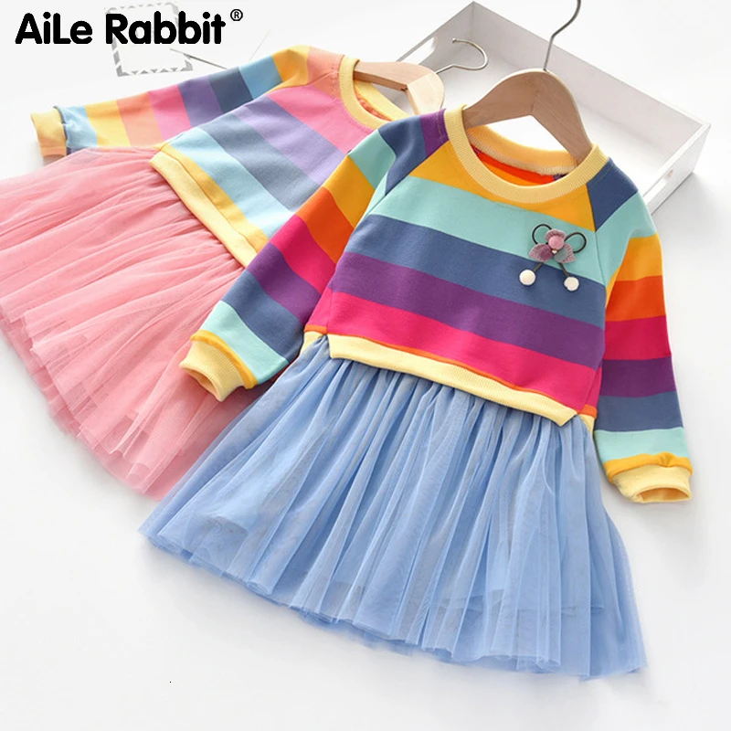 Детское платье для девочек, весеннее Пышное Платье в полоску с длинным рукавом, ярких цветов радуги, 2020