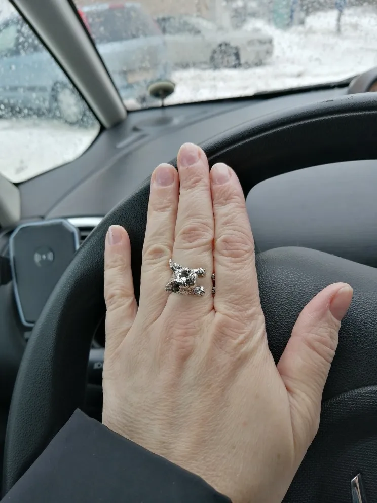 Замечательное изящное колечко, размер регулируется. Жалко, что глазки не камешки-бриллиантики)), в просто провалы.