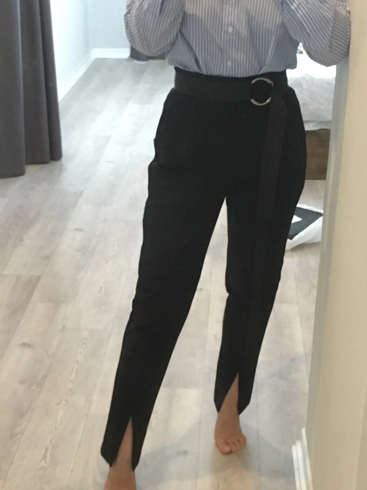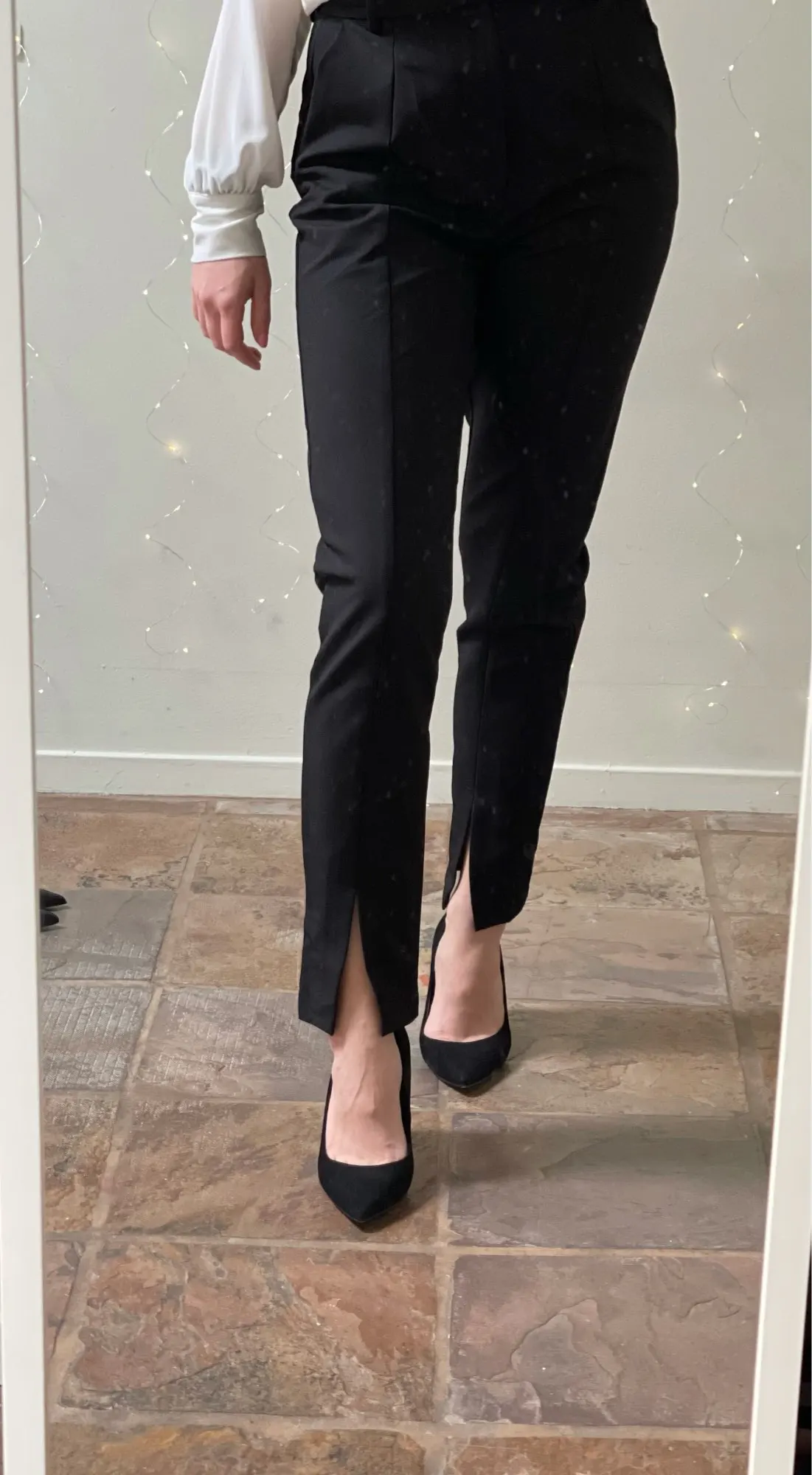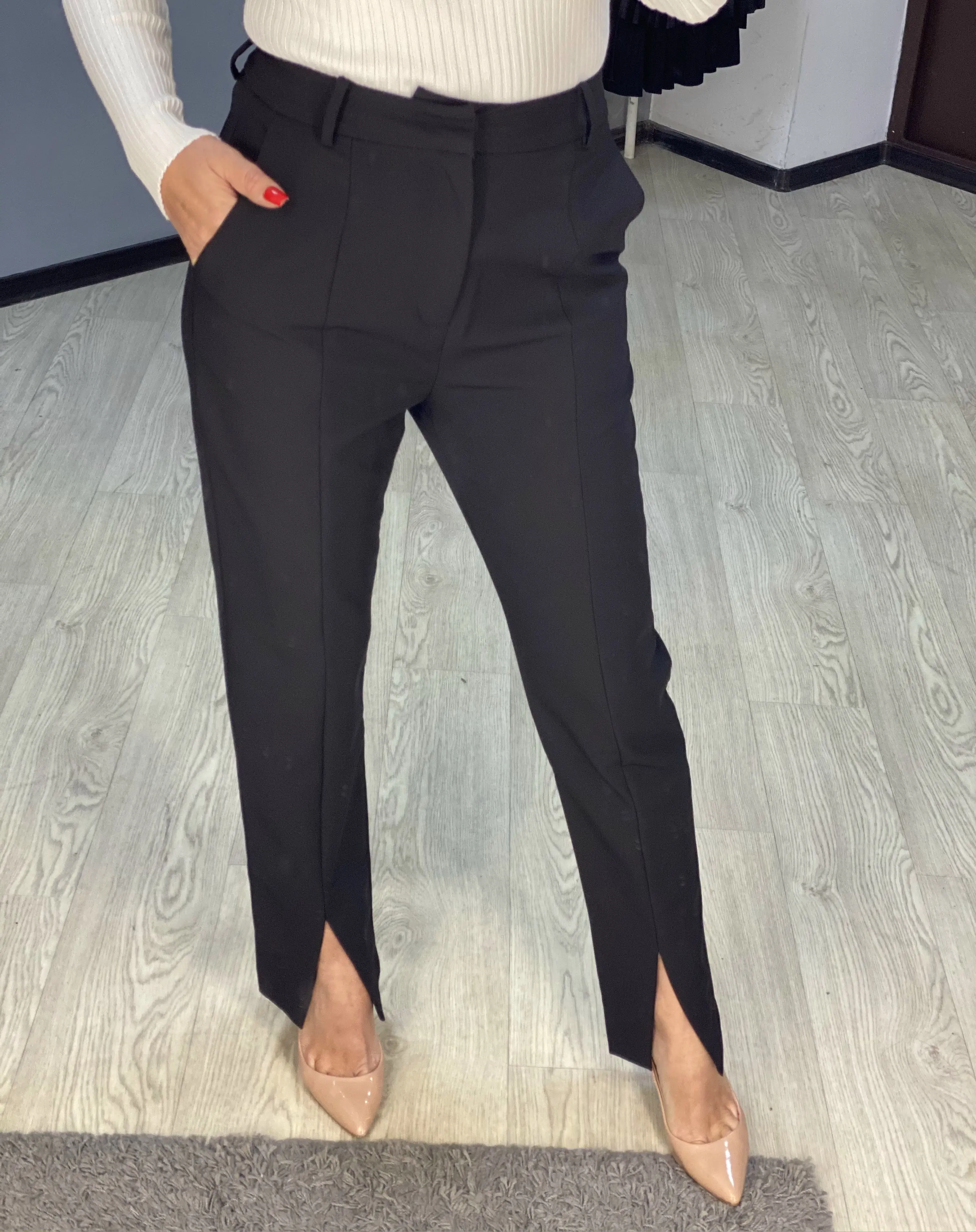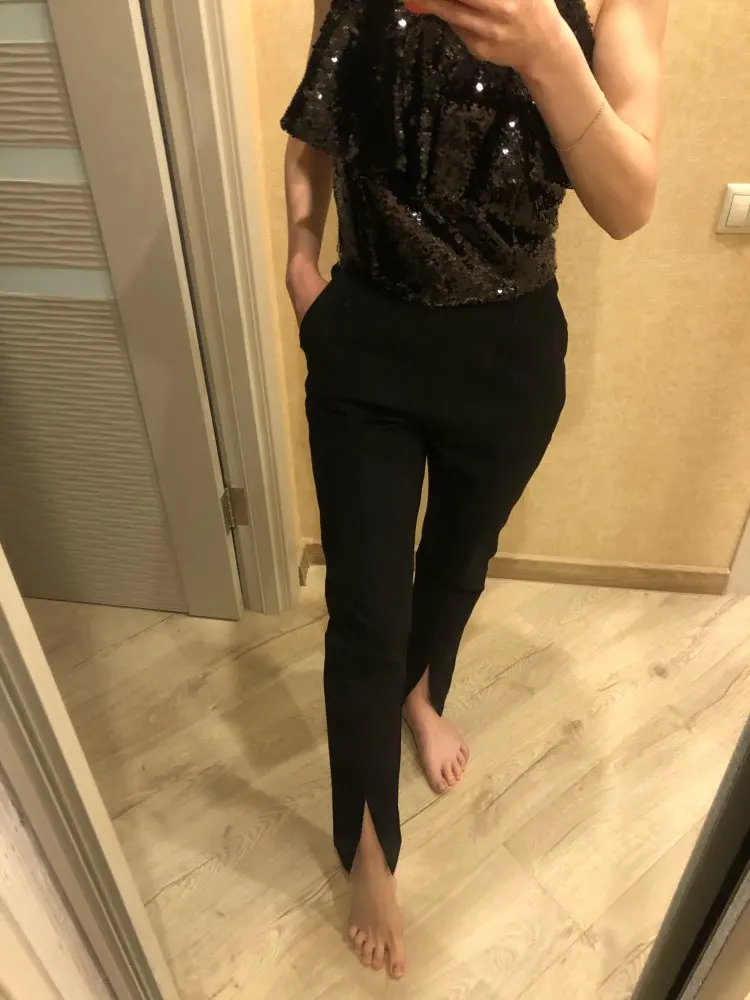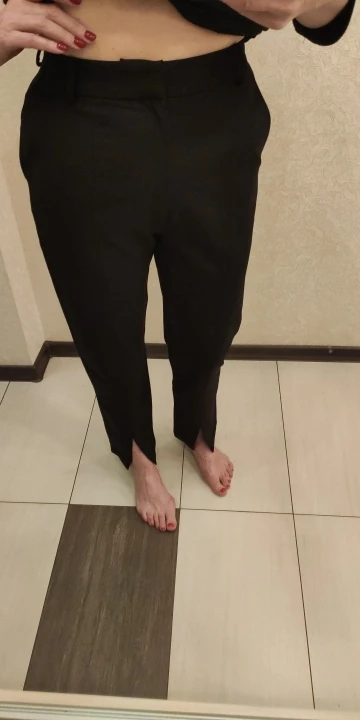 Важные моменты: ✅ на мне размер М, мои параметры 92-68-92, рост 165 см, сели по размеру ✅ в магазине брюки представлены в одной расцветке ✅размерный ряд S-L ✅талия завышенная, по бокам карманы ✅внизу разрезы ✅состав: полиэстер, материал плотный, практически не тянется, не мнется ✅фурнитура качественна ✅качество пошива отличное: строчки ровные, лишние нитки не торчали ✅длина идеальная на рост 165 с каблуком ✅были упакованы в почтовый пакет ✅доставка 1,5 недели ✅стоимость на момент покупки составила 2400 руб. К покупке рекомендую!