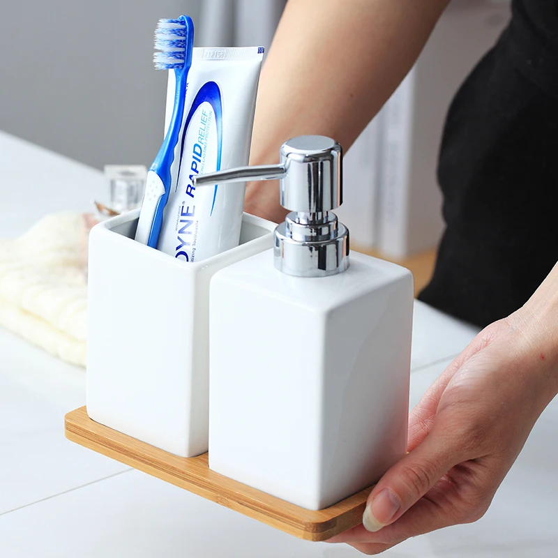 Керамические аксессуары для ванной комнаты с деревянным поддоном, жидкость для мытья рук в бутылке с чашкой деревянная подкладка, дозатор мыла для отелей, эмульсионная бутылка