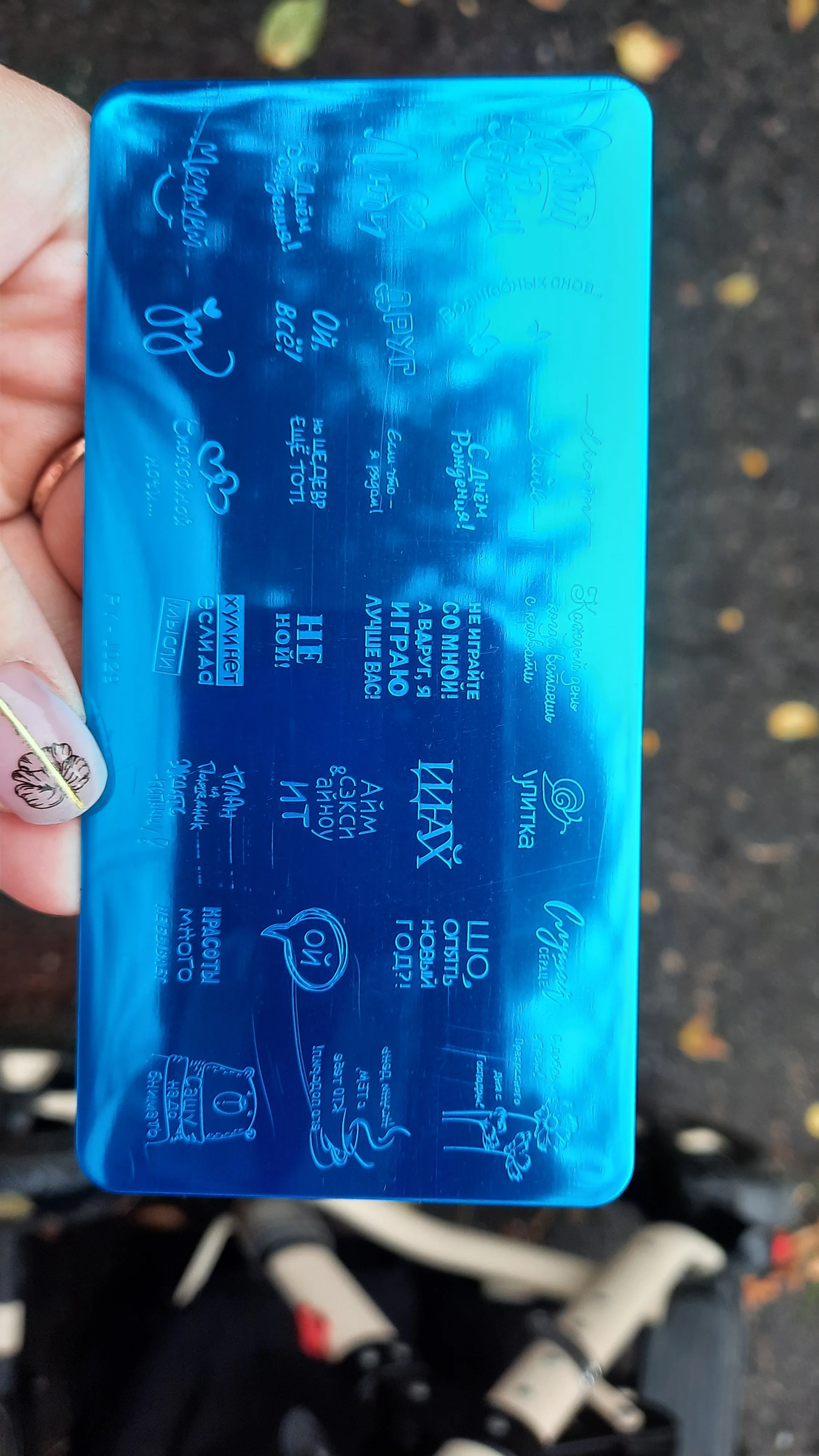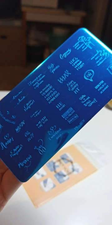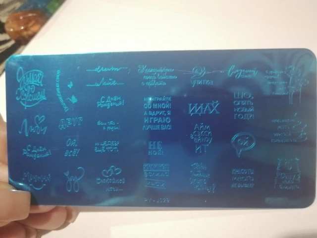 Всё как в описании. Заказала 11 ноября, а пришла 11 января. Хотя было написано, если заказать две штуки, то доставляется быстрее. На самом деле наоборот. Эти заказы почти самые первые. Пластина просто лежала в пакете, но сверху защитная пленка. Хотя бы могли положить в пупырчатую упаковку, тк товар мог бы сломаться. Рисунок четкие, сама пластина без повреждений, ещё пока не пробовала, тк не пришел штамп, который наносит. но думаю проблем с нанесением не будет. На почте посылка не отслеживалась, лишь только на территории продавца. На сайте отслеживается, но бегунок идет очень долго стоила 82 руб
