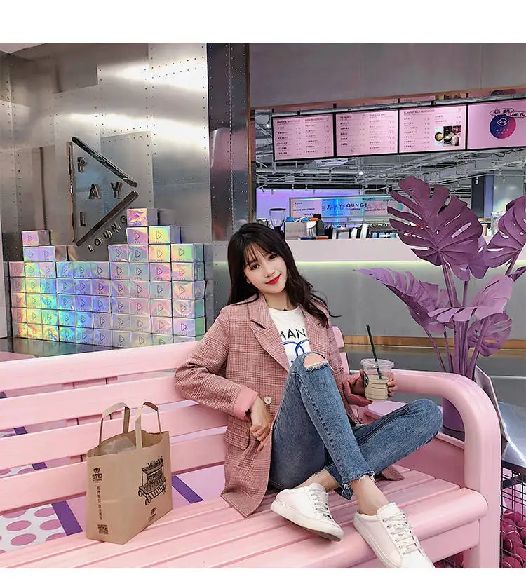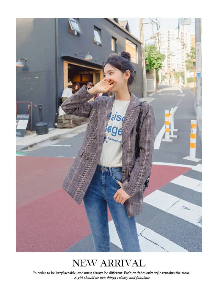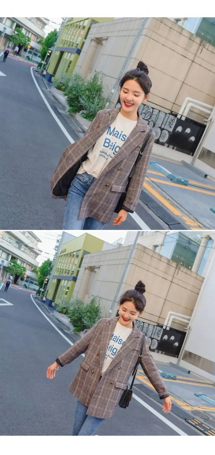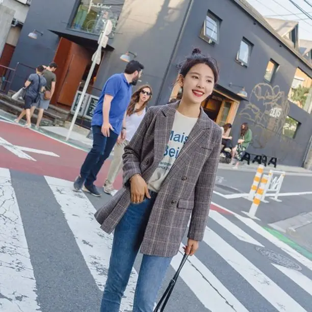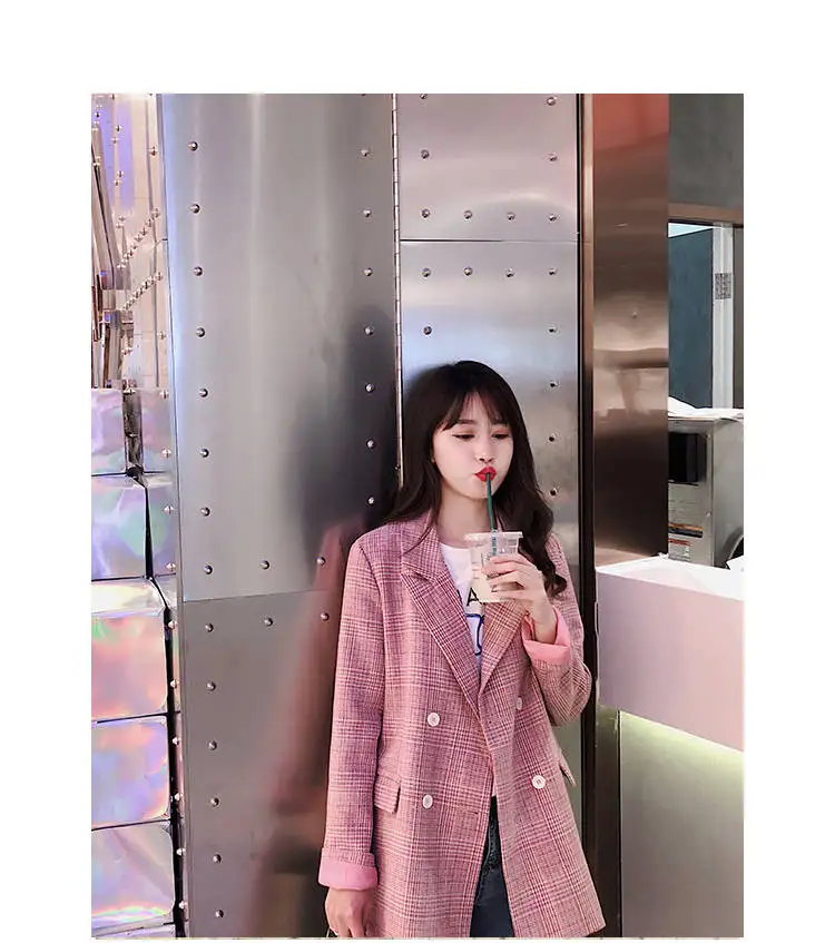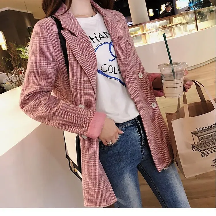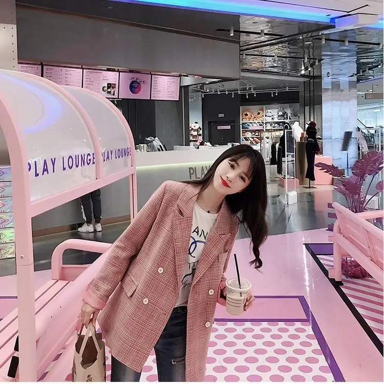 JuneLove 2020 Весна Женщины Двойной Брестед Blazer Урожай офис леди Формальное Blazer пальто женские куртки с длинным рукавом Сыпучие плед