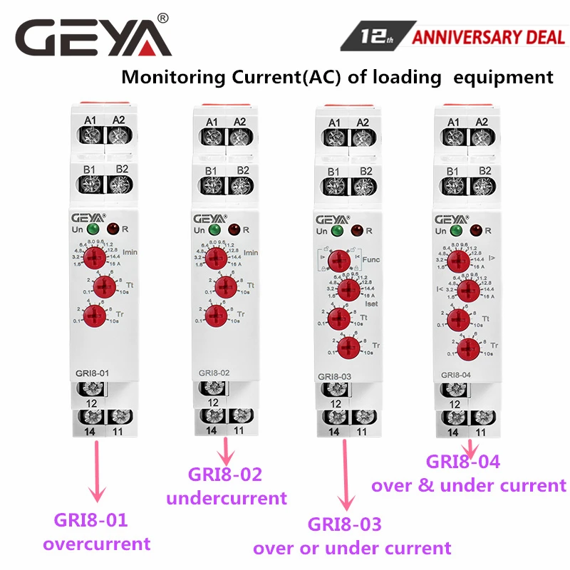 Реле контроля тока GEYA GRI8, диапазон перегрузки по току, переключатель пониженного тока 0,05-16 А, AC24-240V или 24 В постоянного тока