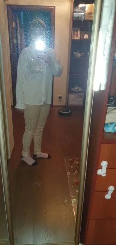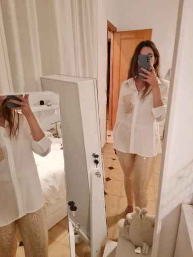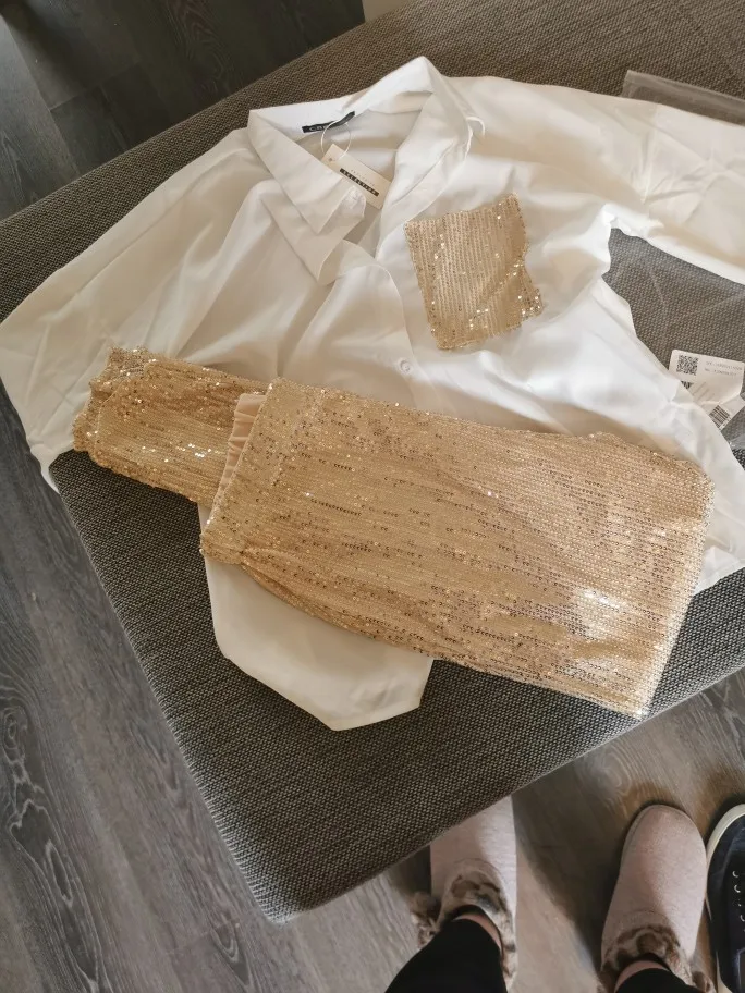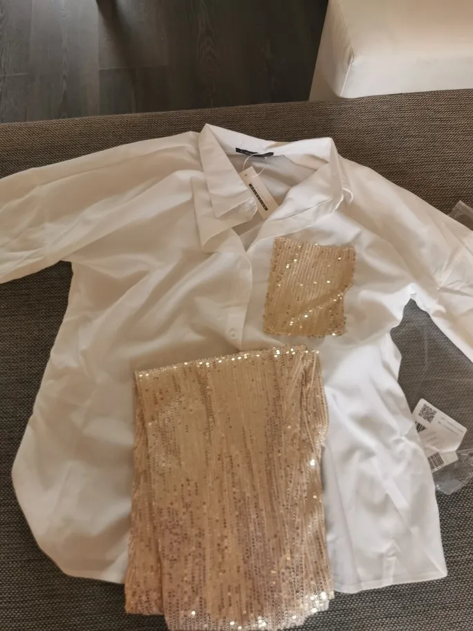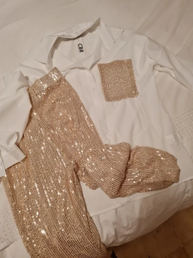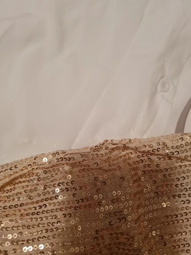 Рубашка очень милая, ткань вкусная и с каплей. Это немного прозрачно, но выглядит хорошо, мне очень нравится. Брюки, тем не менее, немного слабее... у него меньше тела, чем на фотографиях, и меньше блесток тоже. Одна из болтов плохо сшита и с отверстием. Это может быть решено, но я ожидал большего