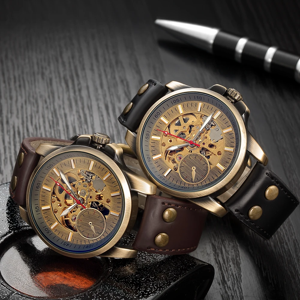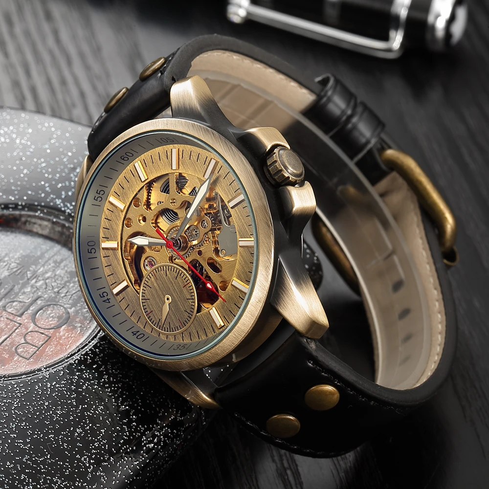 Часы-скелетоны Мужские механические с автоподзаводом, из натуральной кожи
