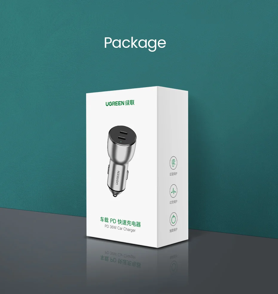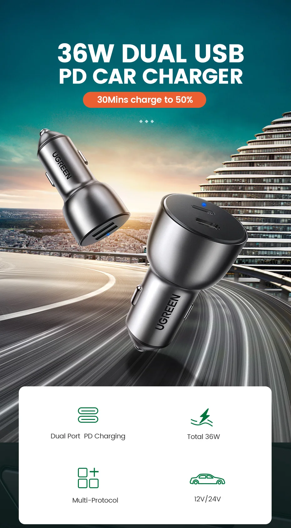 Автомобильное зарядное устройство Ugreen с 2 USB-портами и поддержкой быстрой зарядки 3.0, 36 Вт