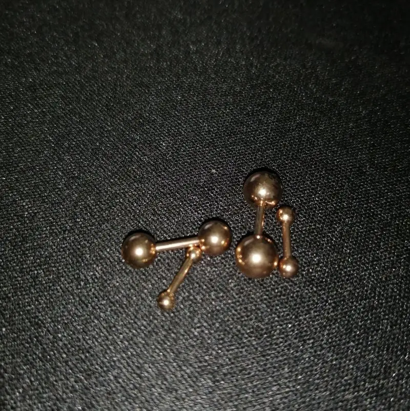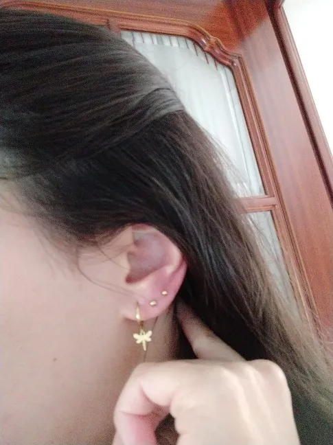 серьги просто чудо ❤️ трудно с ногтями было надеть) выглядят невероятно, удобные , боялась что будет слишком широкая штанга, но лично мне подошла я в полном восторге. у меня 5 проколов, сейчас заказала ещё 1 набор на всякий случай) выбрала розовое золото - выглядят естественно