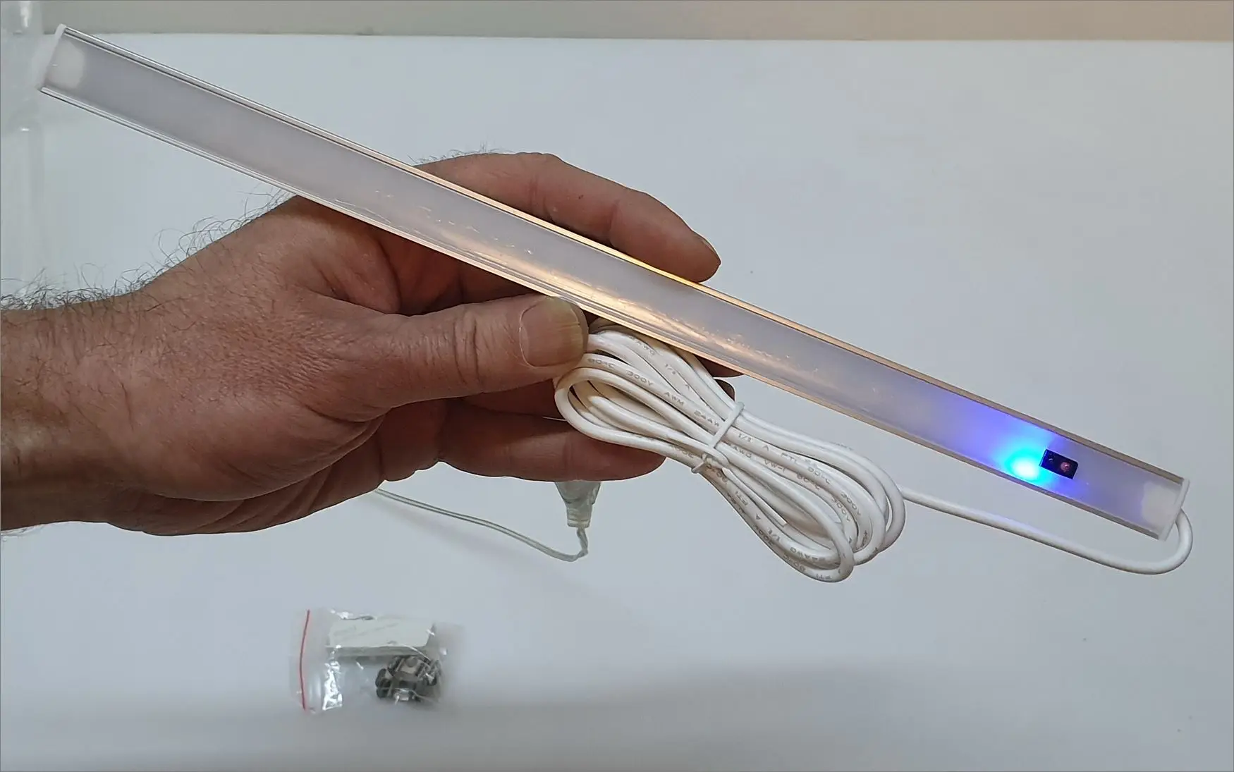 Светильник замечательный. То что я хотела. Для подсветки кухни в самый раз. Плоский, это то что надо под шкафами совсем не видно. Светит ярко. Прикрепили на клипсы которые были в комплекте. В общем всё хорошо. Заказывайте, в Леруа такой в разы дороже. Пришел быстро и качественно упаковано, без повреждений. Провод длинный примерно 2 метра, в usb розетку.