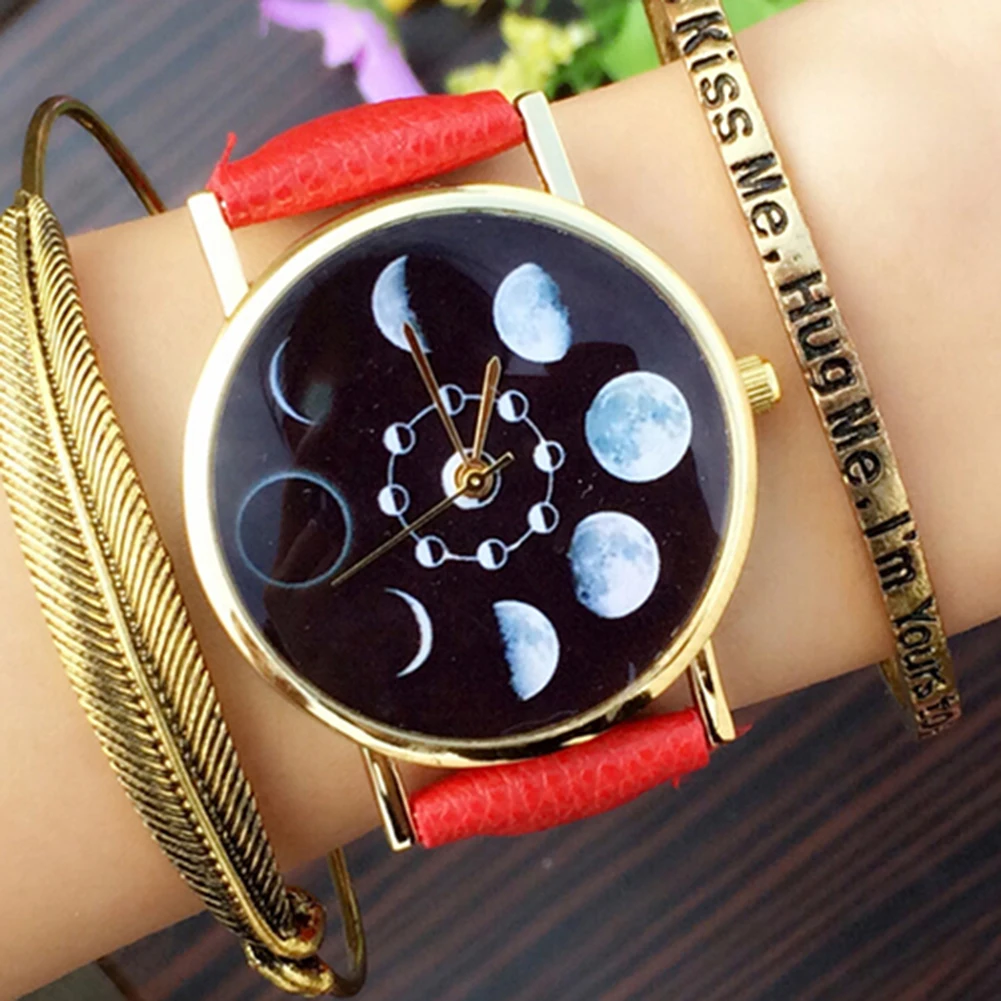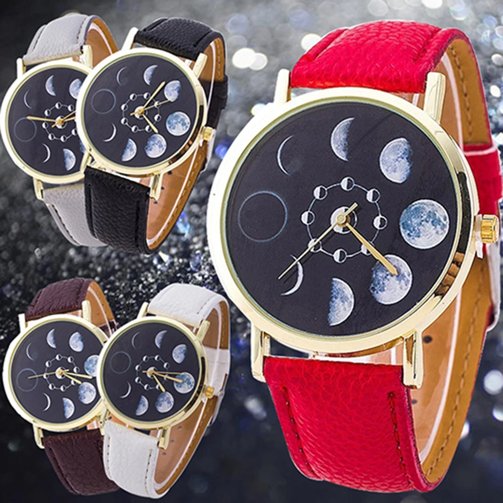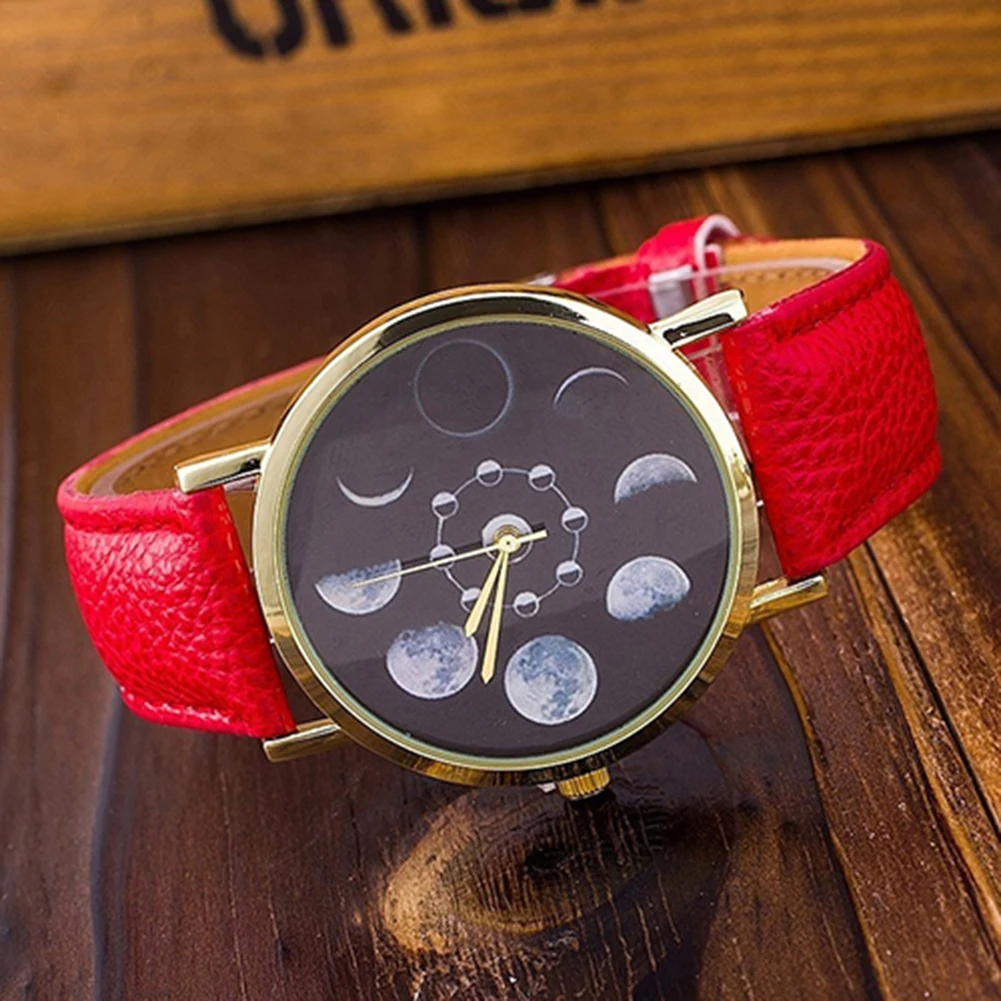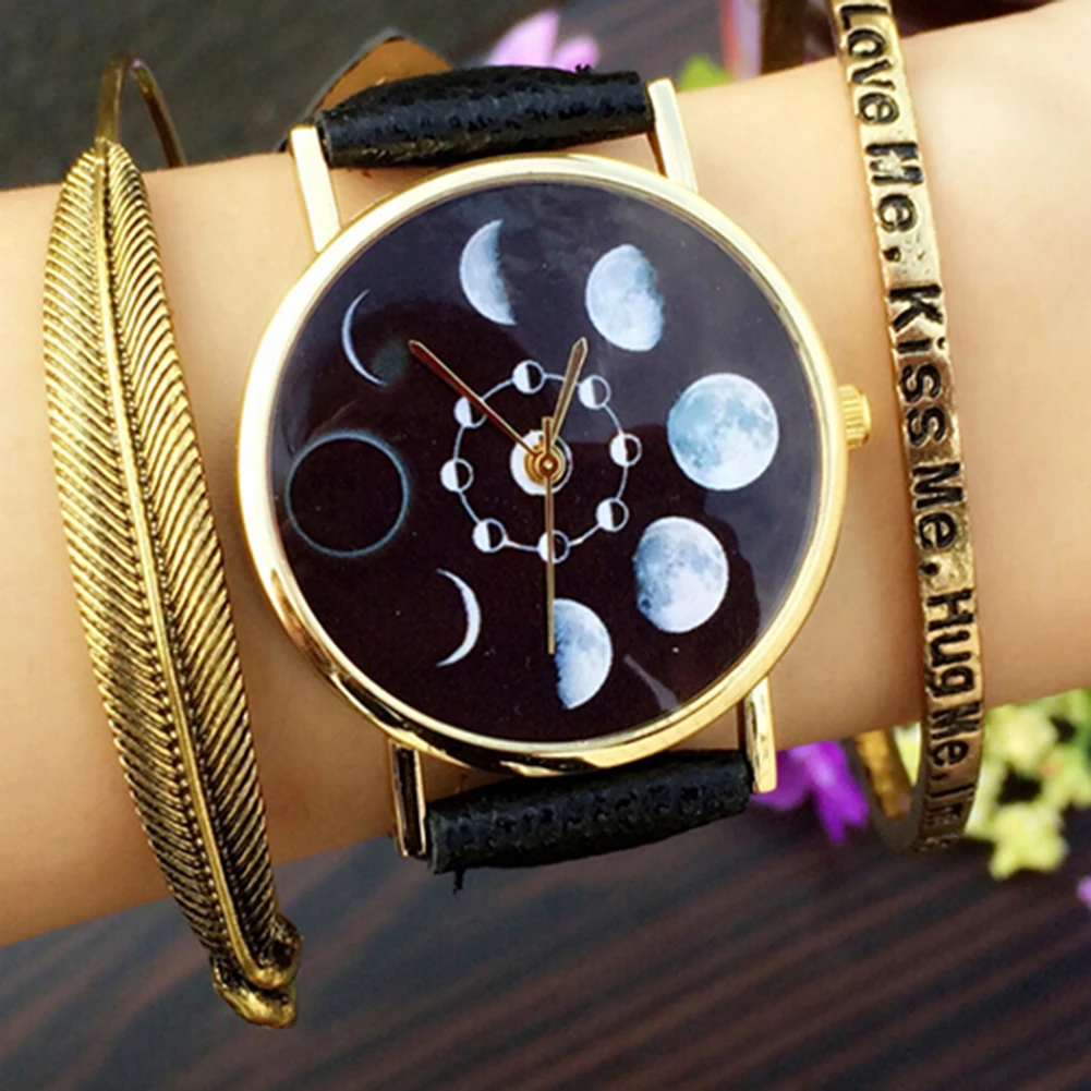 Часы наручные женские кварцевые аналоговые с лунным затмением и кожаным ремешком