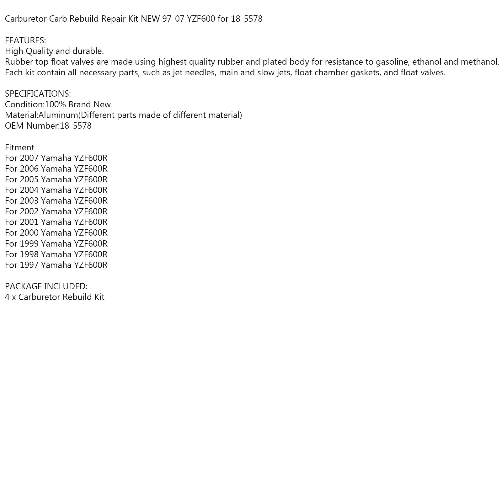 Описание Карбюратор Carb комплект для ремонта и восстановления для 00-07 YZF600 для 18-5578