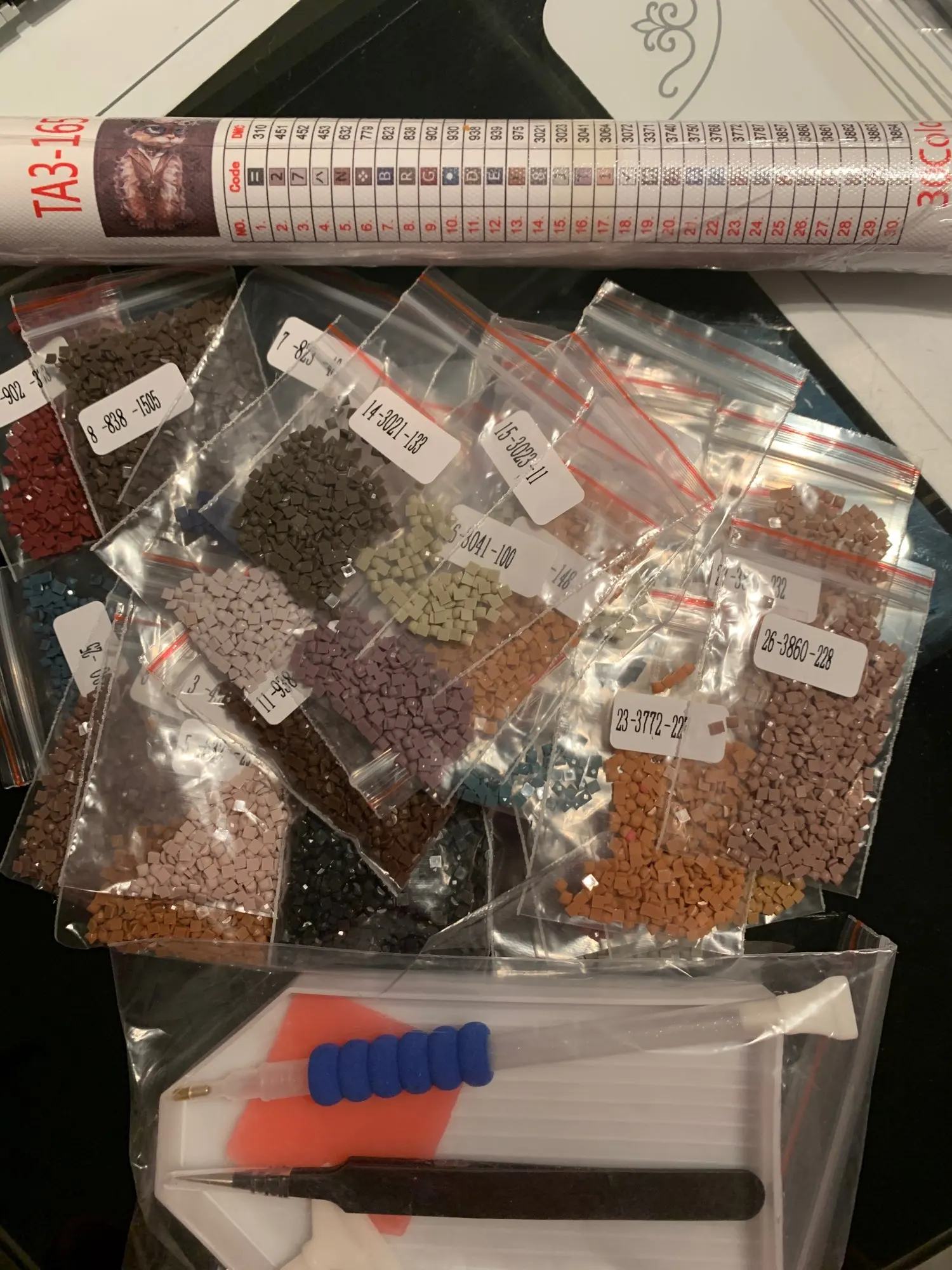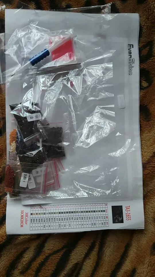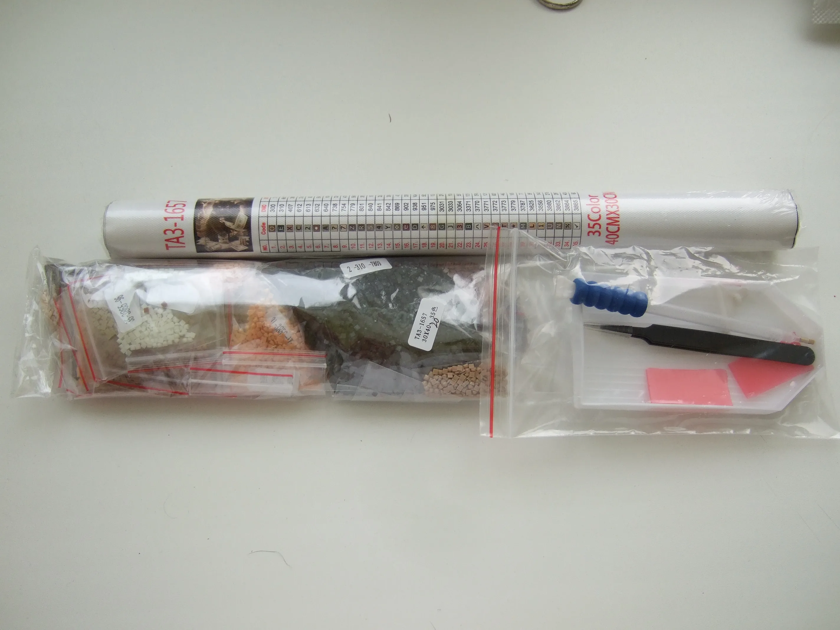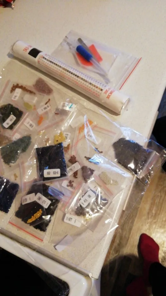 упаковка слегка помялась, но с содержимым всё в порядке. камешки сложены по цветам в пакеты с застёжкой, ручка-стик оснащена мягкой поролоновой вставкой для удобной работы. цветов очень много, дополню отзыв после завершения. доставка чуть медленнее молнии)
