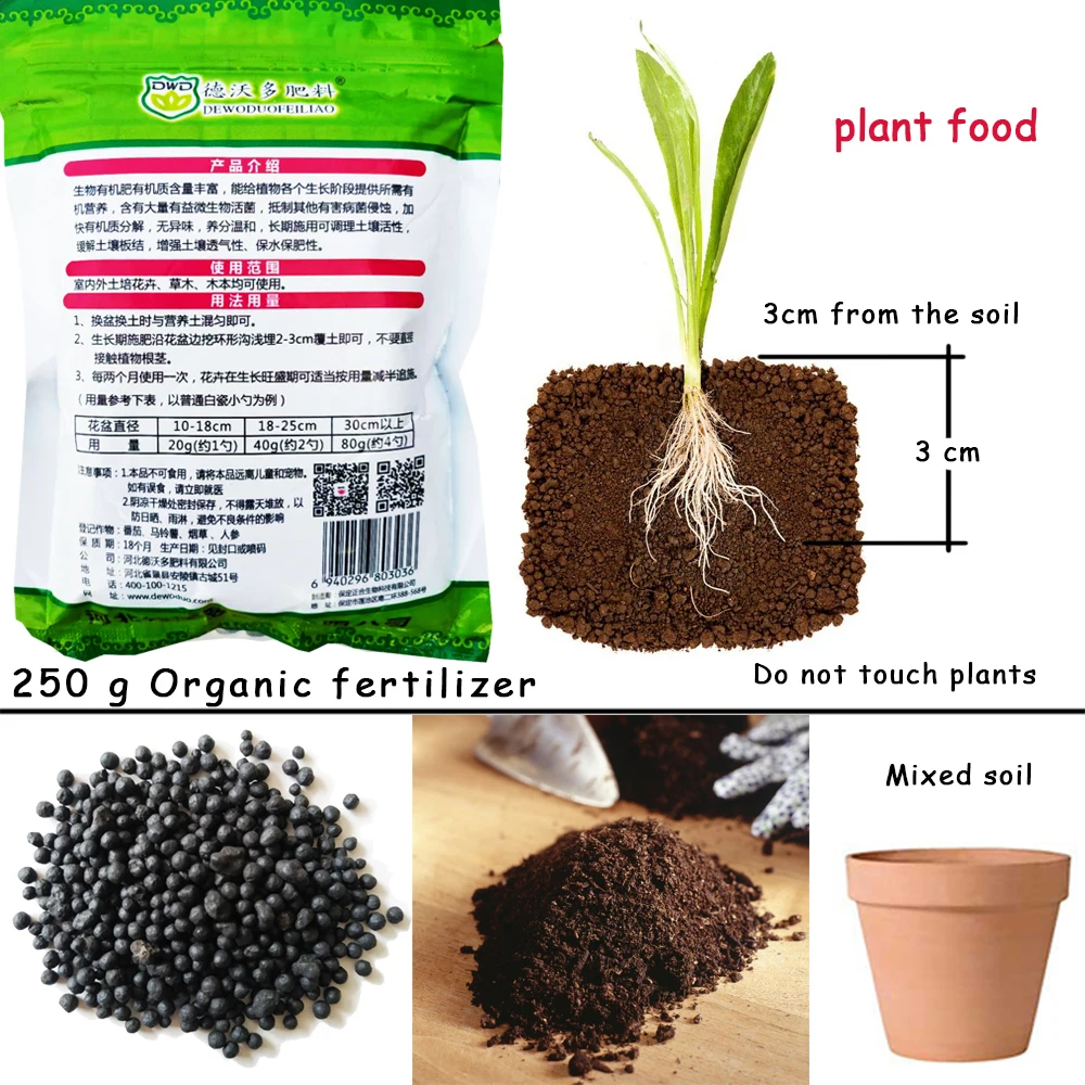 Размер горшка:≤ 10 см5g (2 ложки)10-18 см20 г (8 ложек) 18-25 см40 г (16 ложек)≥ 30 см80 г (32 ложки) 250 г биологическое органическое удобрениеБогат органическими веществами и богат Общими элементами азота, фосфора и калия. Он обеспечивает необходимые органические питательные вещества для различных стадий роста растений, содержит большое количество полезных микробов, а также противодействует эрозии других вредных бактерий, ускоряет разложение органического вещества, не имеет запаха и питательных веществ. Легкое и длительное использование может регулировать почвенную активность, облегчить агломерацию почвы, повысить проницаемость почвы, удержание воды и плодородие. Цель использования: Можно использовать внутренние и наружные цветы, газоны, деревья и культуры. Инструкции: 1. Смешайте с питательной почвой при смене горшков. 2. Удобрение в вегетационный период, вдоль цветочного горшка выкопайте круглую канавку, неглубоко закопанную на 3 см, чтобы покрыть почву, не контактируйте напрямую с корнями растений. 3. Используйте один раз в 2 месяца, цветы можно уменьшить в два раза больше необходимого количества в период интенсивного роста.