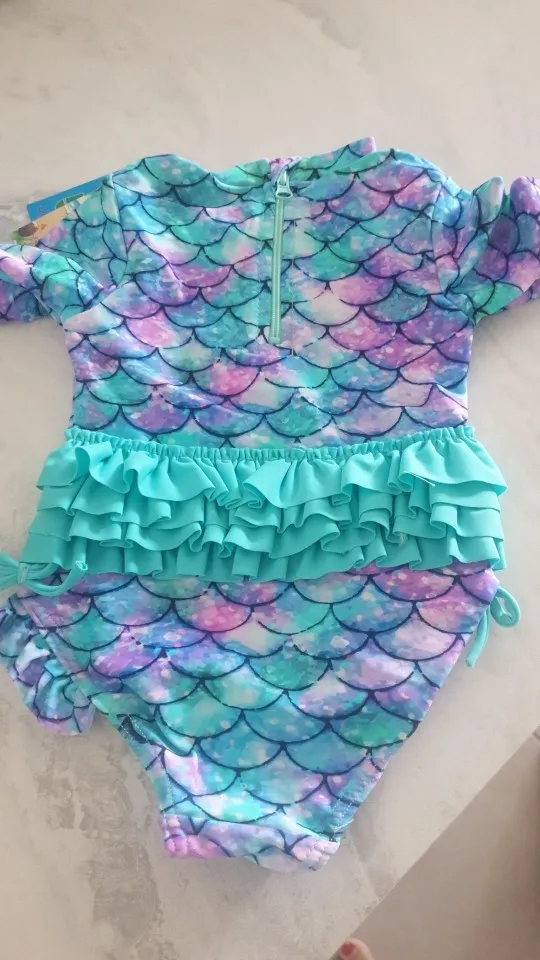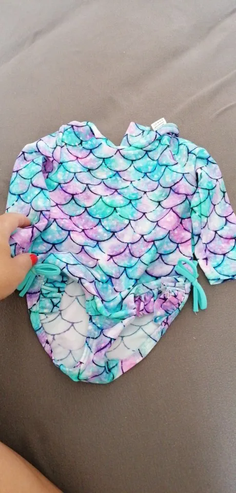 el traje de baño es hermoso en la foto no se logra distinguir lo bonito y bien hecho que está lo compre 12 meses pero lo ocuparé en mi bebé de 4 meses y está muy bien el tamaño en verdad me enamore del traje de baño