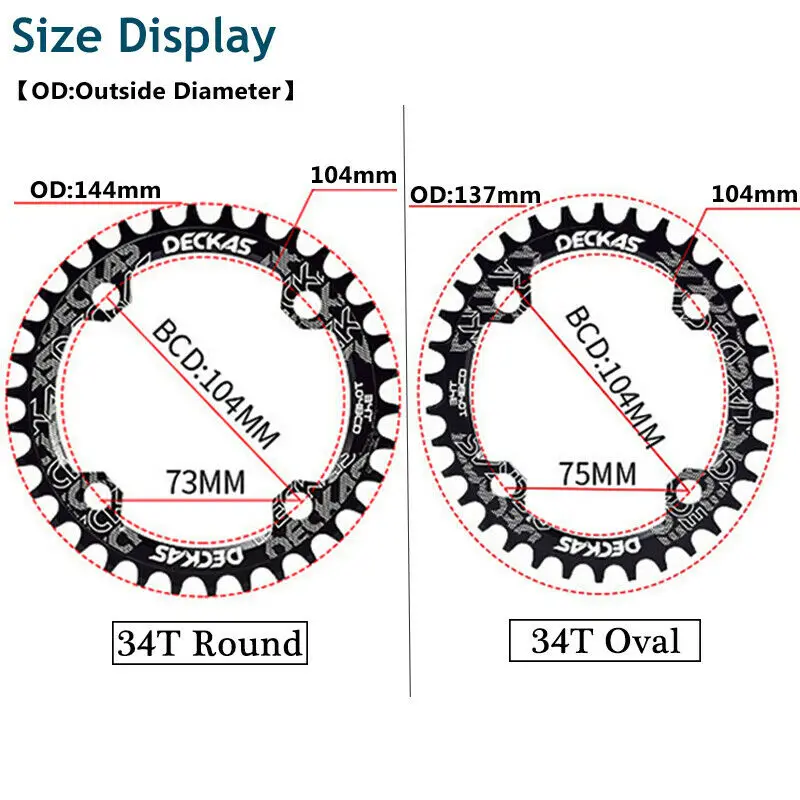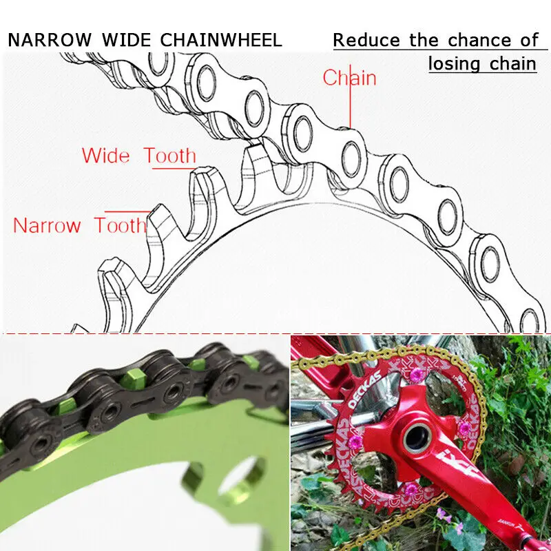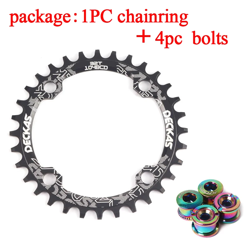Бренд: DECKAS Тип: Единая скорость Цвет: черный, красный, золотой, фиолетовый, серебряный, зеленый, синий Материал: алюминиевый сплав 7075-T6 Диаметр болта: 104 мм BCD Зубы: 32/34/36/38T Толщина: 4 мм (1,9 мм узкая, 3,7 мм широкая)