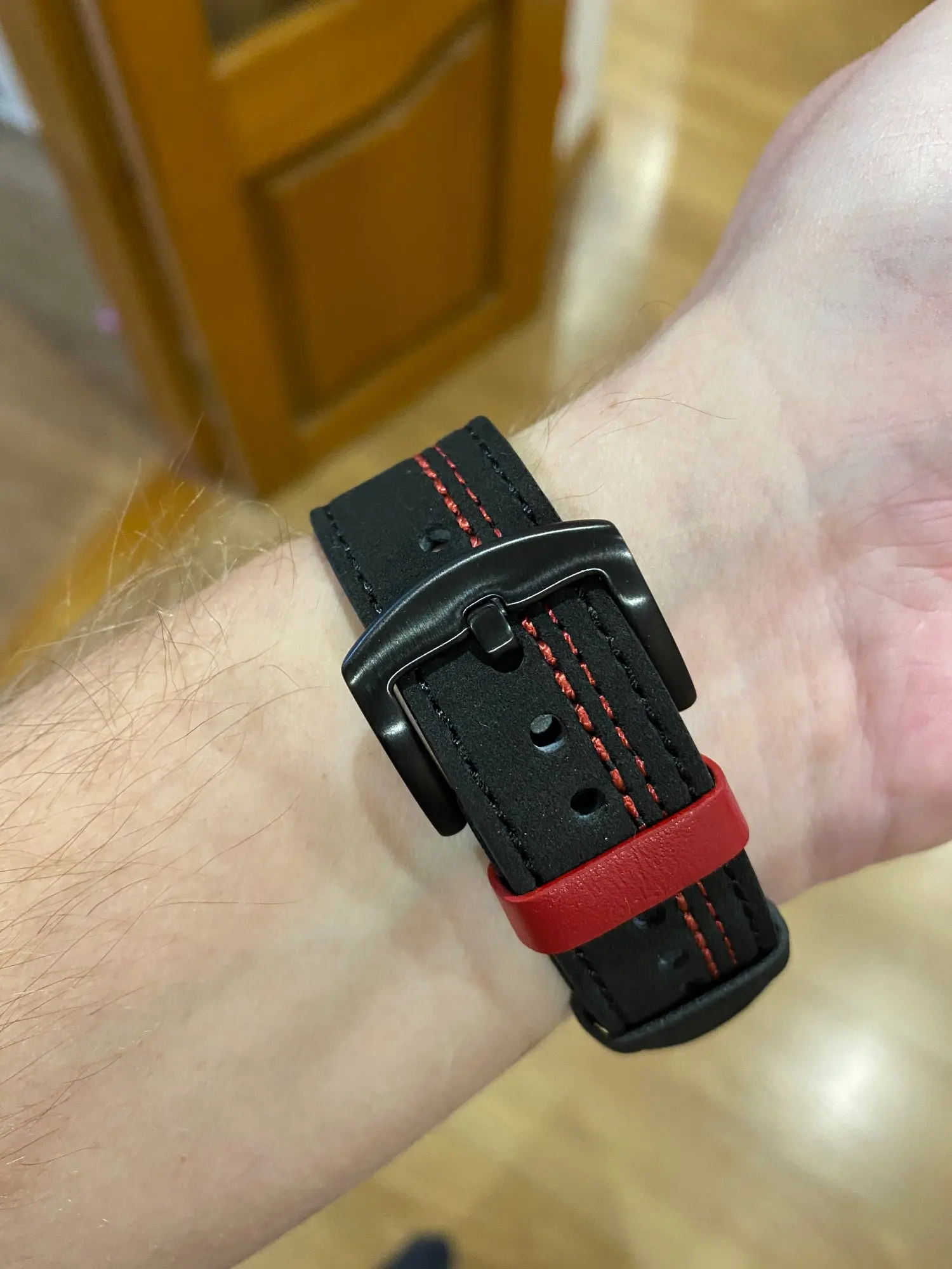 ремешок классный и мягкий. часы с ним на руке сидят удобно. не очень понял как управляться с застёжкой и стоило ли делать такую.. но пусть будет))