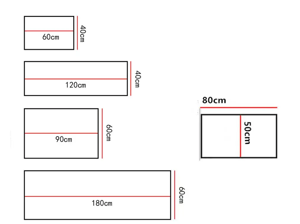 2. Размеры: 60x180 см, 60x90 см, 40x120 см, 50x80 см, 40x60cm