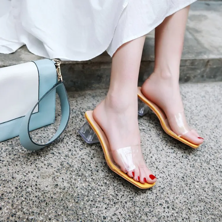 Женские босоножки; Обувь знаменитостей; Простой стиль; Прозрачные туфли на высоком каблуке с пряжкой из ПВХ; Цвет желтый; 889