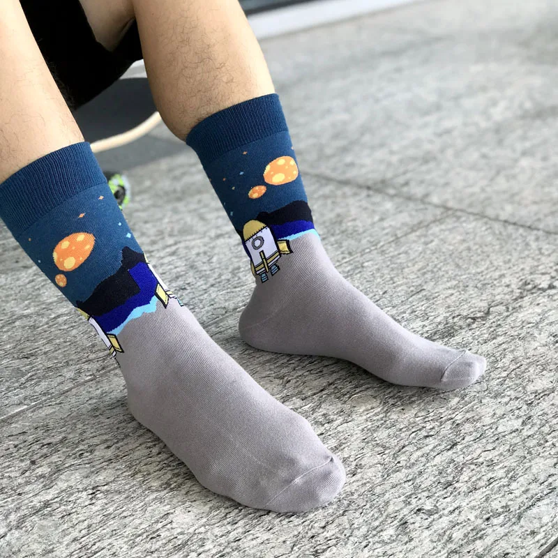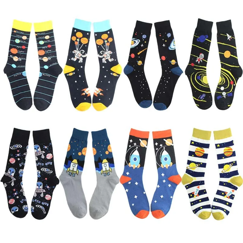 Мужская мода высоко-качественный чесаный коттоновые носки Веселые подвеска в виде космонавта и планеты космический корабль ракета с иностранным узором Носки happy обувь для мужчин, подарок на день рождения