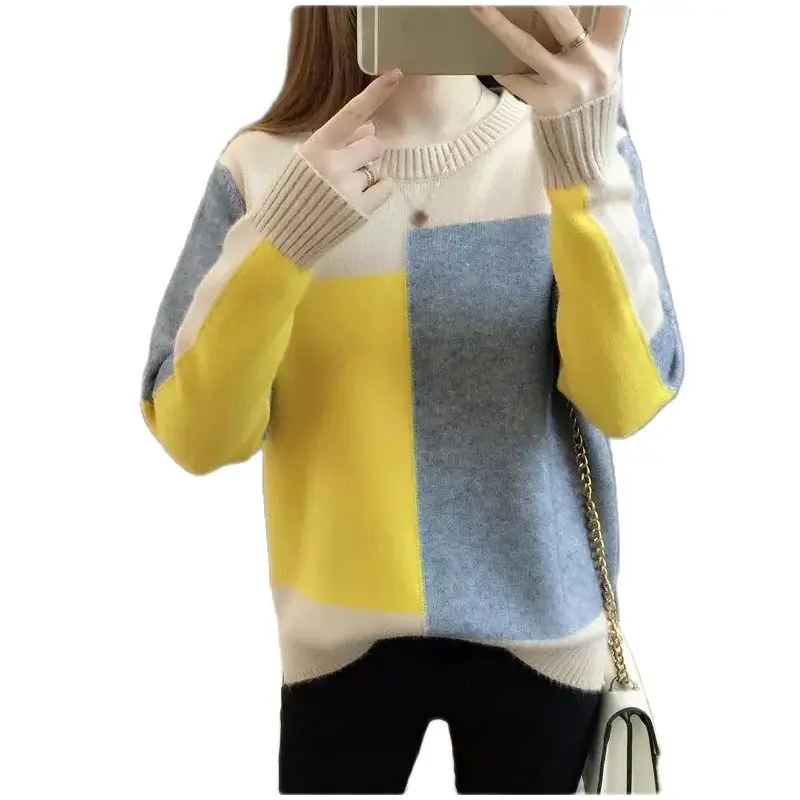 Женский джемпер с длинным рукавом, трикотажный свитер контрастных ц...