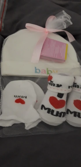 пришло быстро красиво упаковано. сама виновата что не посмотрела и пришло без шапочки))))) белые носочки с клубничкой и царапки. царапки сделаны как носочки из того же материала
