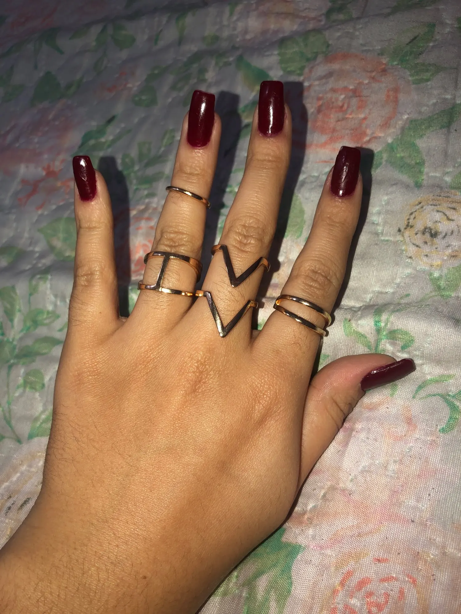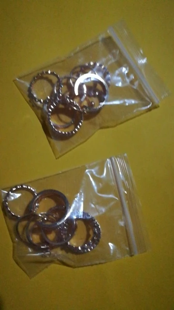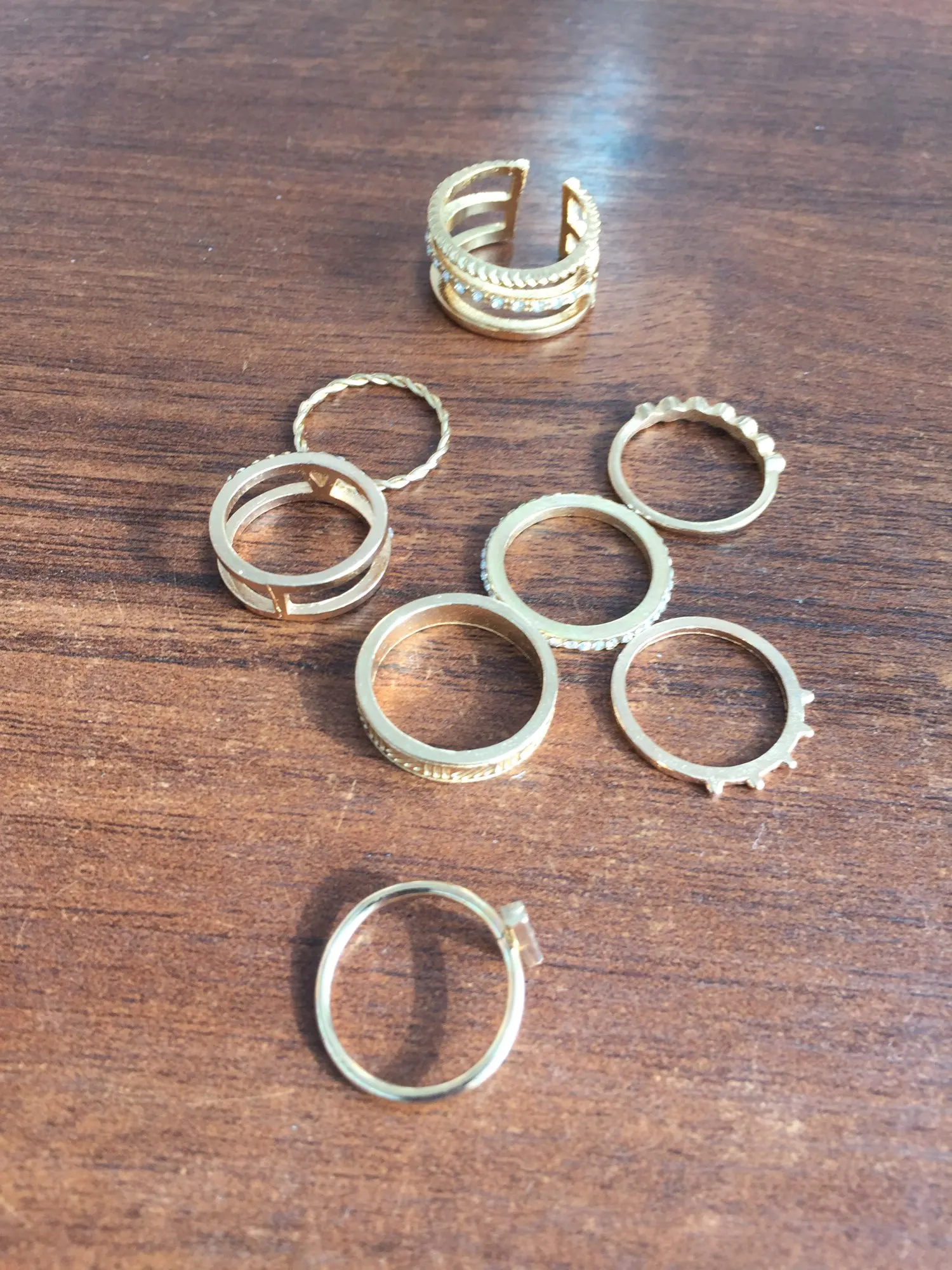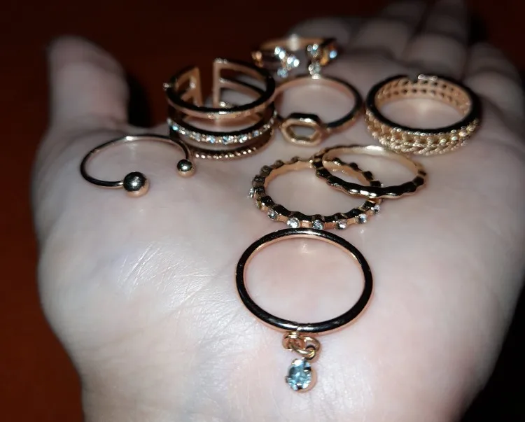 Выглядят вполне себе - на уровне китайской бижутерии за свои деньги. Одно кольцо пришлось подпилить, ибо неровные острые края. Одно из колец даже регулируемое. Металл. На совсем тоненькие пальчики не подойдут, довольно большие