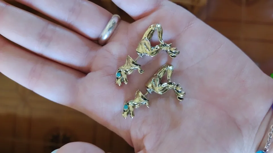 Эти серьги великолепны! Они такие же, как на картинке. У них хороший размер, и детали глаз с голубыми драгоценными камнями действительно красивые. В упаковке одни серьги, поэтому я купил две пары. Доставка была невероятно быстрой!