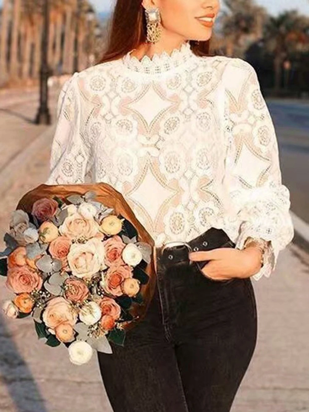 Новинка, модная женская блузка, кружевные белые топы, блузка с лямкой на шее, повседневный пуловер с длинным рукавом и колокольчиком, женские рубашки, весна-осень 2022