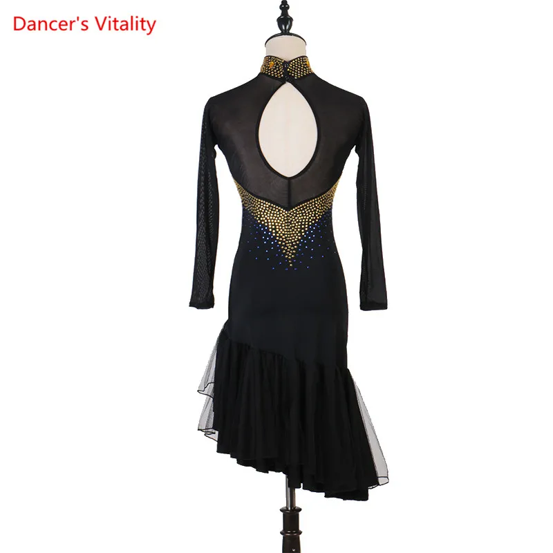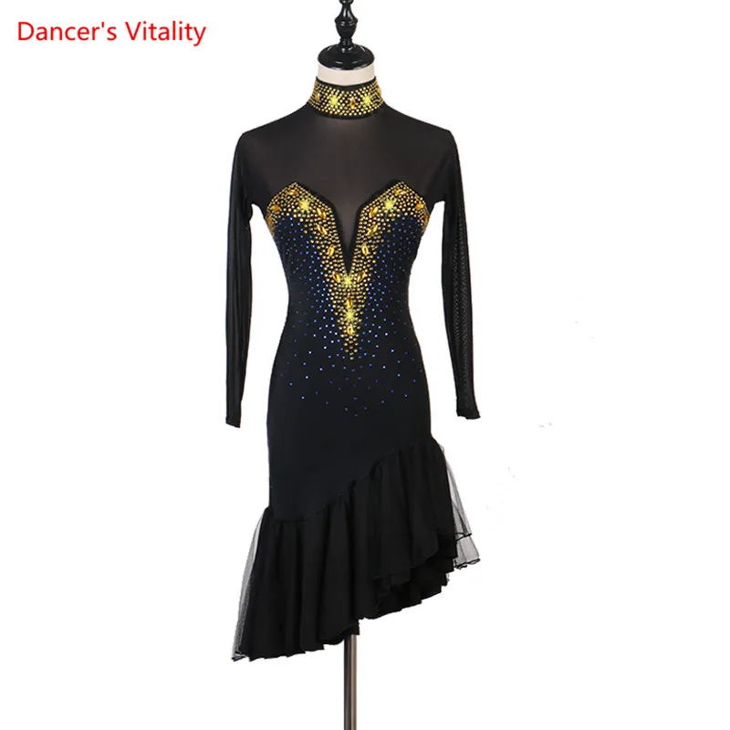Женское платье для латинских танцев, черное платье для танцев, ассиметричная юбка для соревнований, одежда для вечеринок, танцев, выступлений, латинских платьев