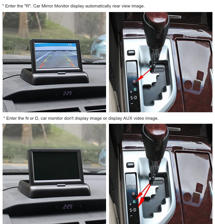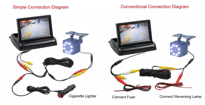 4.3'' monitor, compact size with glossy case design for a luxury look; One button with foldable function for easy operation, better protection when unused; Connect up to 2 cameras for multi-direction view; Auto switch between 2 video inputs, support Video2 reversing priority; Cooling vents and double-sided paster design for better item protection.