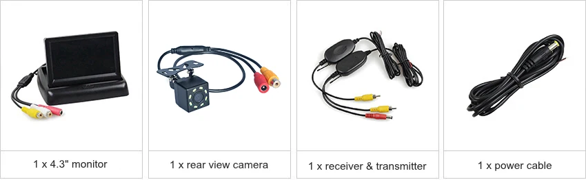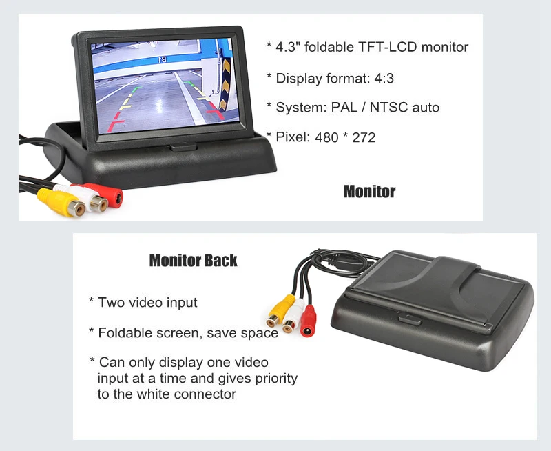 Монитор: цифровой TFT LCD Диагональ экрана: 4,3 дюймов Формат дисплея: 4:3 Мощность: 3 Вт Питание: DC12V Видео: 2AV вход Авто переключатель заднего хода Система: PAL / NTSC автоматический переключатель Контраст: 350:1 Пиксель: 480*272