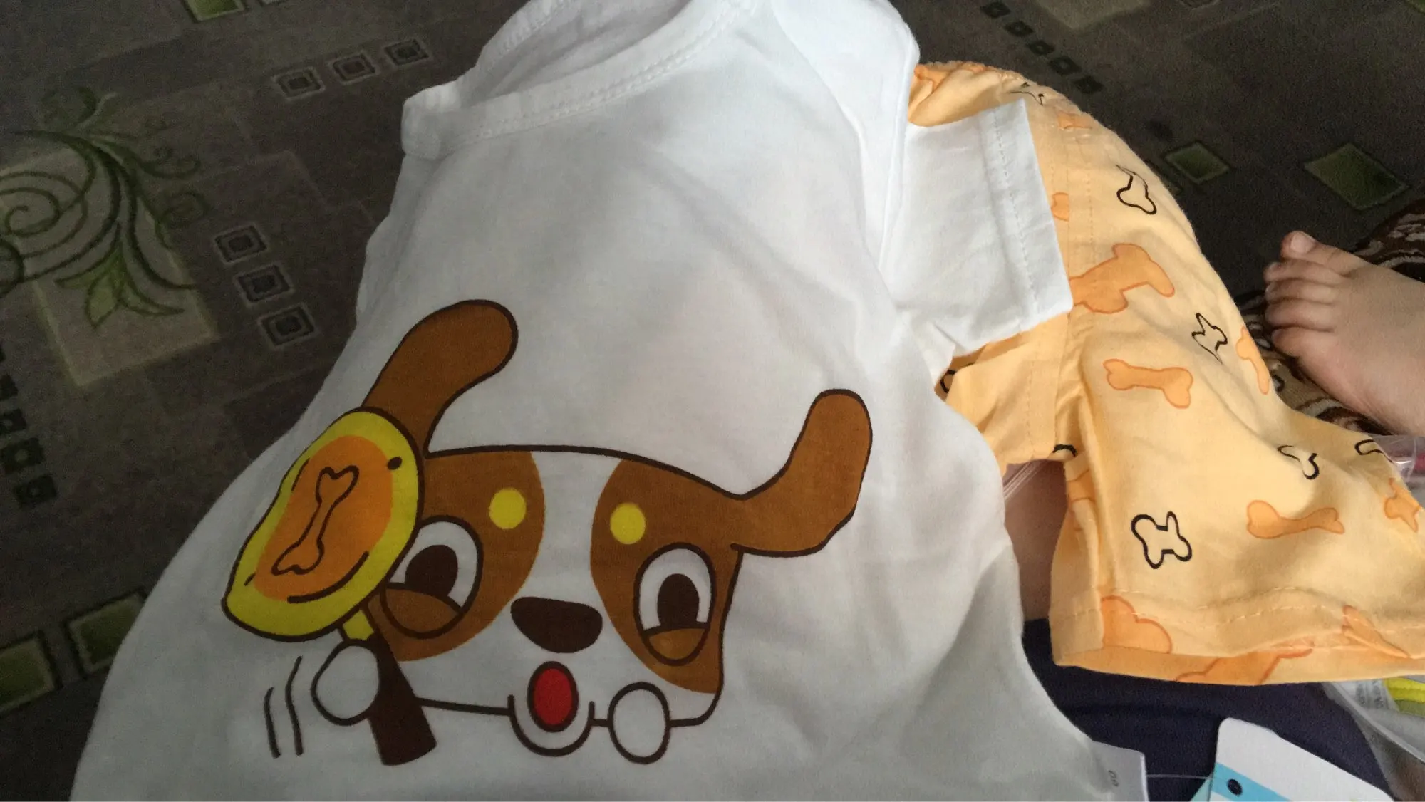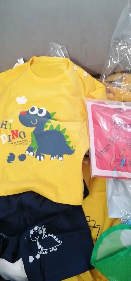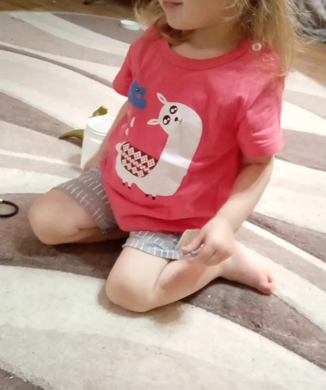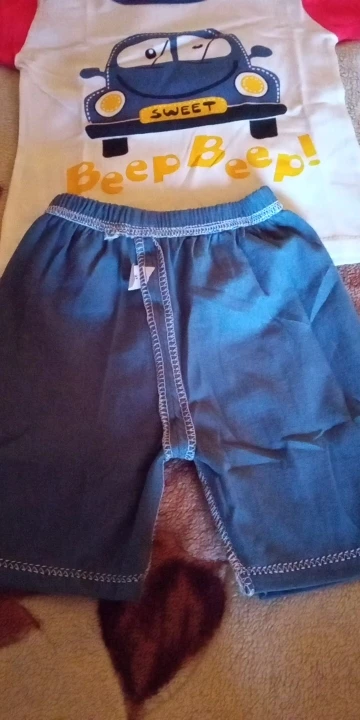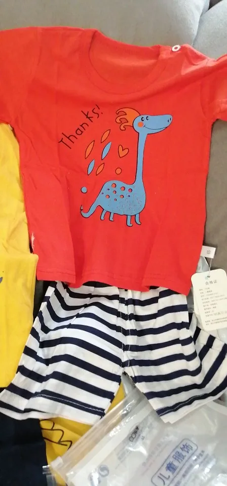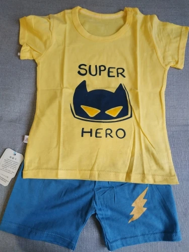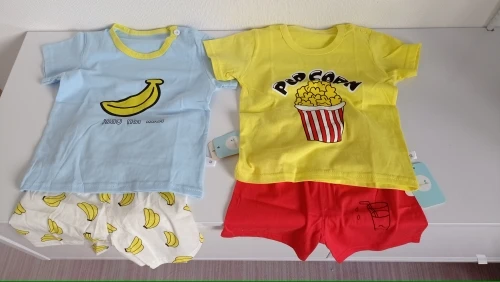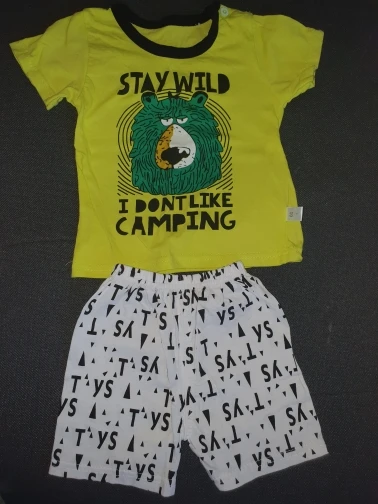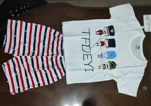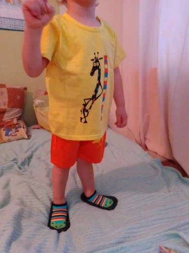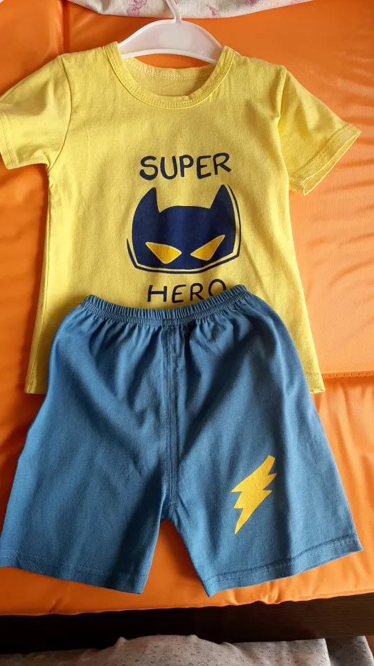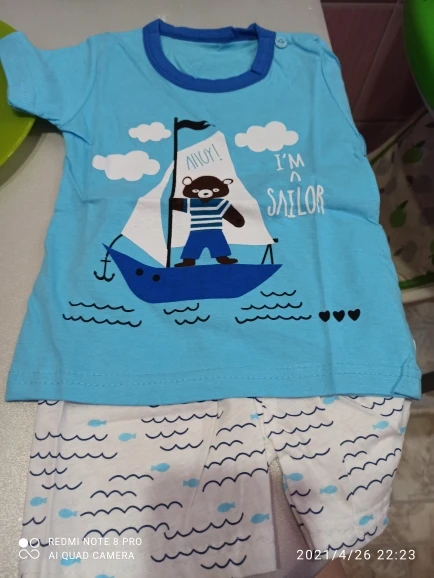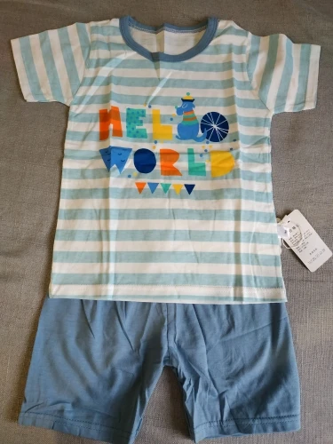 Яркий красивый костюм, есть пару торчащих ниток и на футболке как полезлая бирка, не очень симпатично. На ребёнка 10кг,6м, брала размер 12м, футболка как раз, шорты если только без памперса. Так что маломерят точно. А так прикольный костюм. Жалко, что пока пришёл, долго не поносит сын