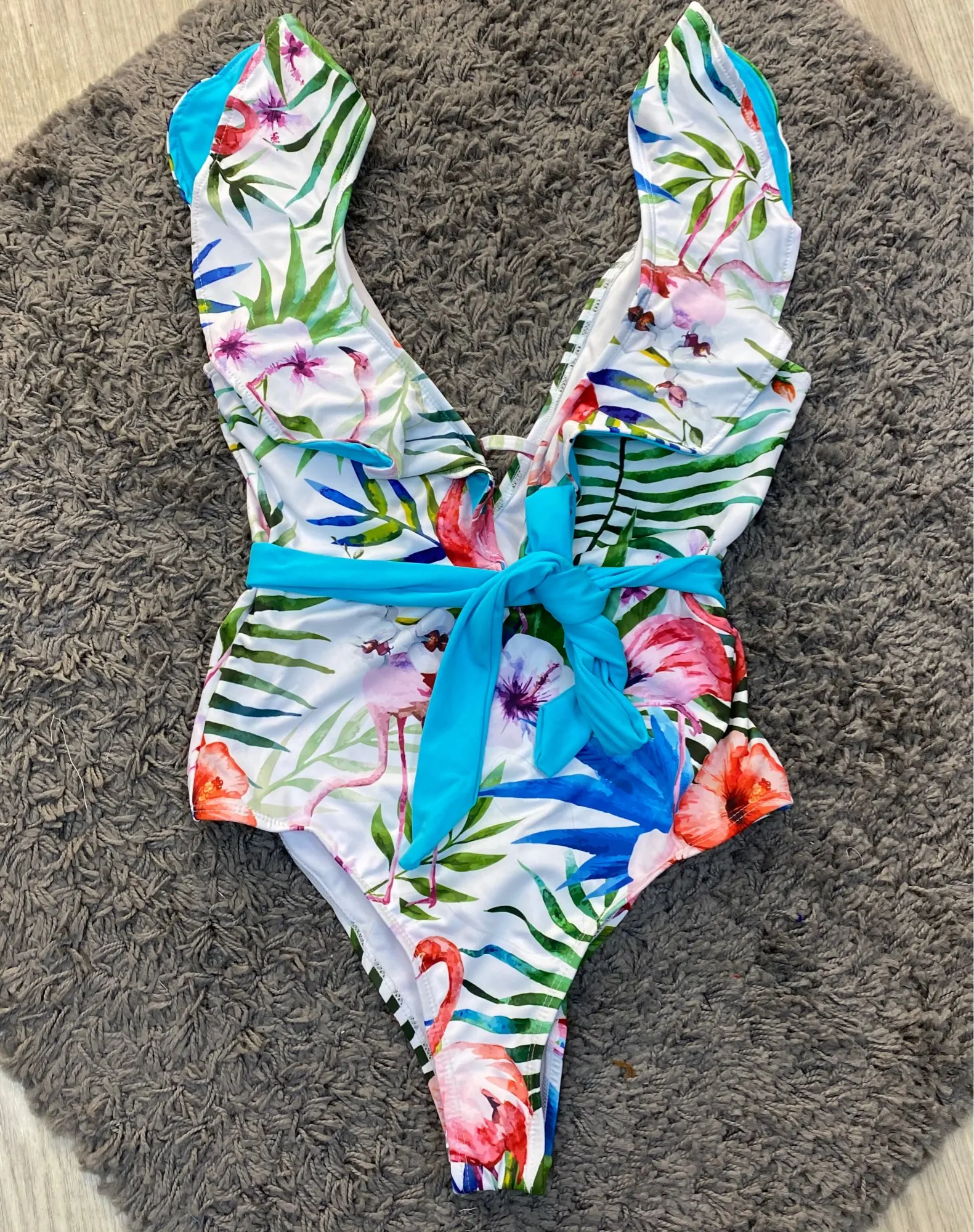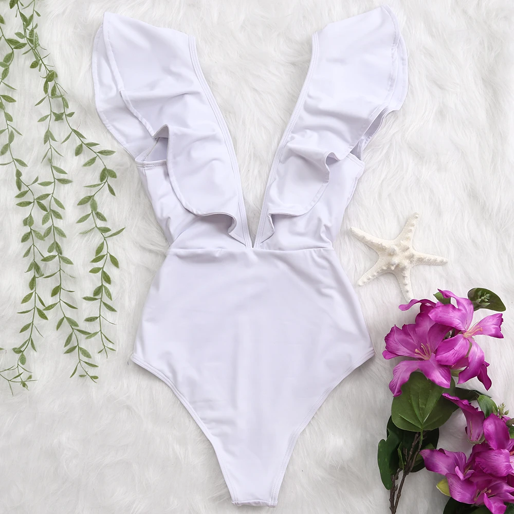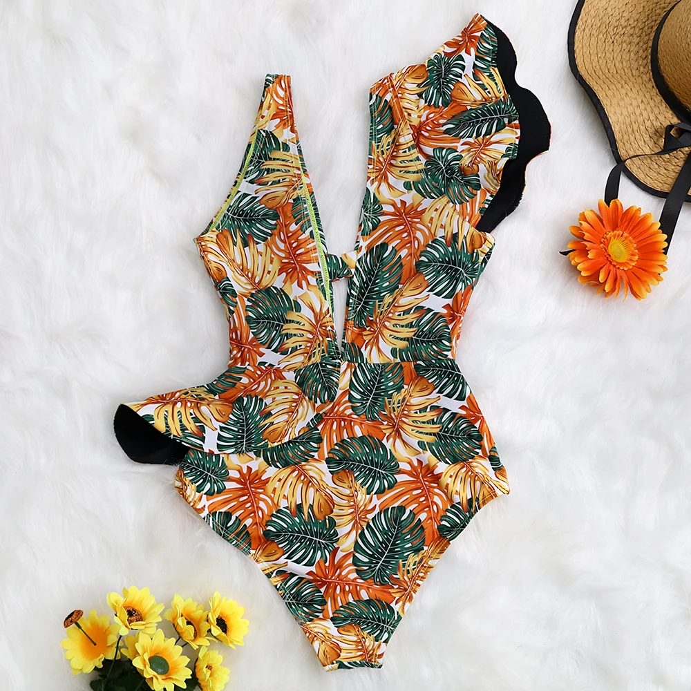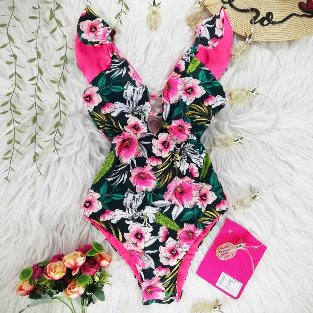 Женский слитный купальник, с оборками и цветочным принтом, с открытыми плечами, однотонный пляжный костюм-монокини, 2021