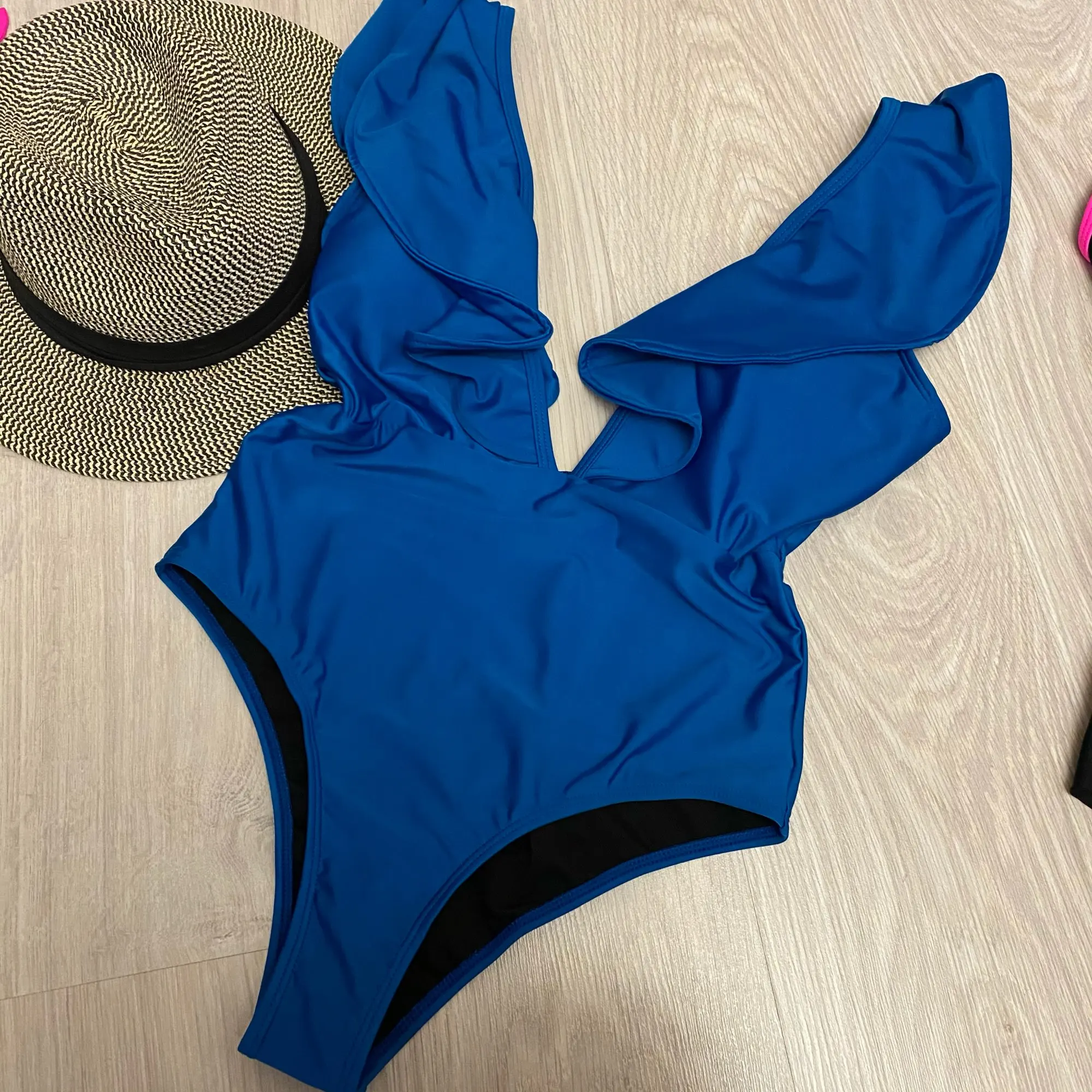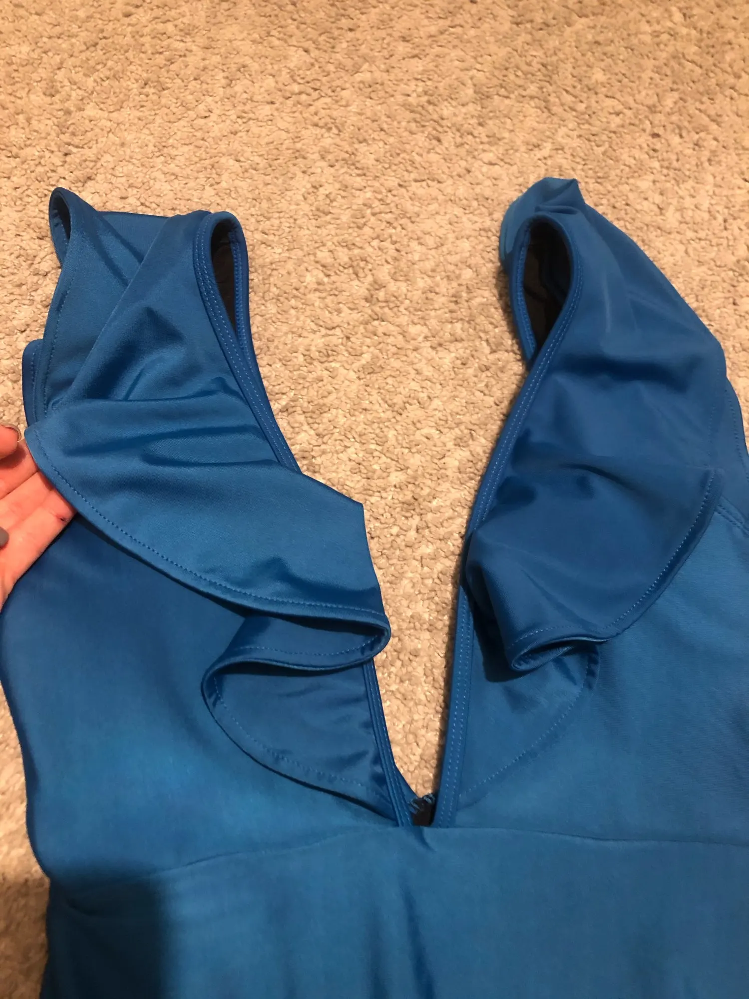 Очень красивый купальник. Ткань плотная Гладкая прекрасно тянется и не просвечивает. На 88 – 60 – 94 рост 172 см подошел идеально. Ткань прекрасно тянется. Есть подкладка. В груди есть вкладки. Рюша двойная прекрасно держит форму. Пошив Фабричный.