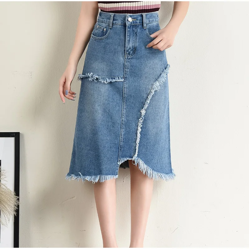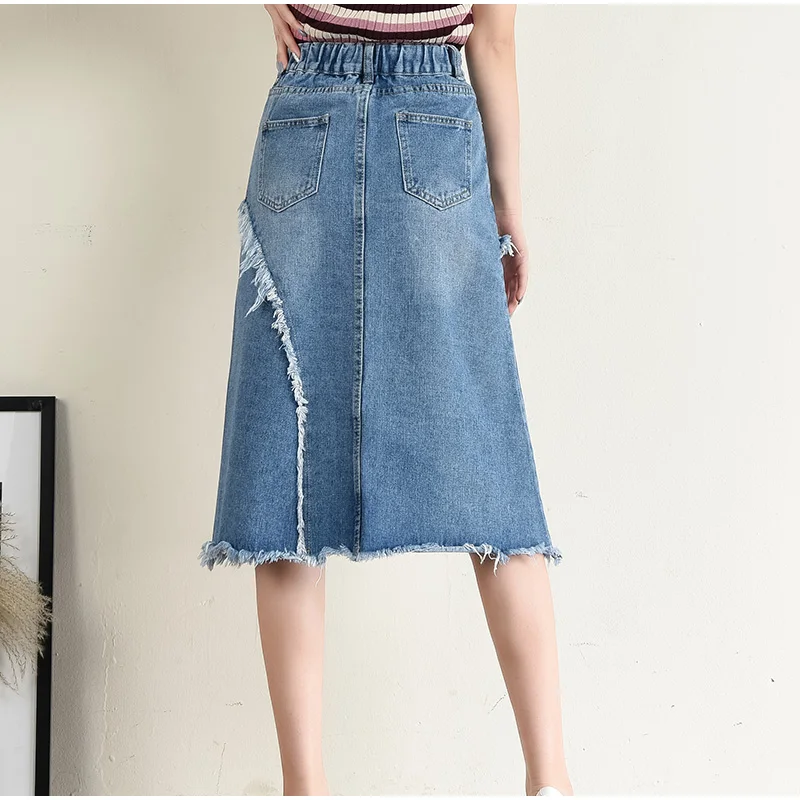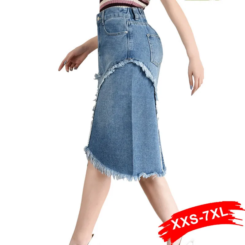 Длинная джинсовая юбка, винтажная голубая уличная юбка средней длины с эластичным поясом и бахромой, модель 5Xl, лето размера плюс