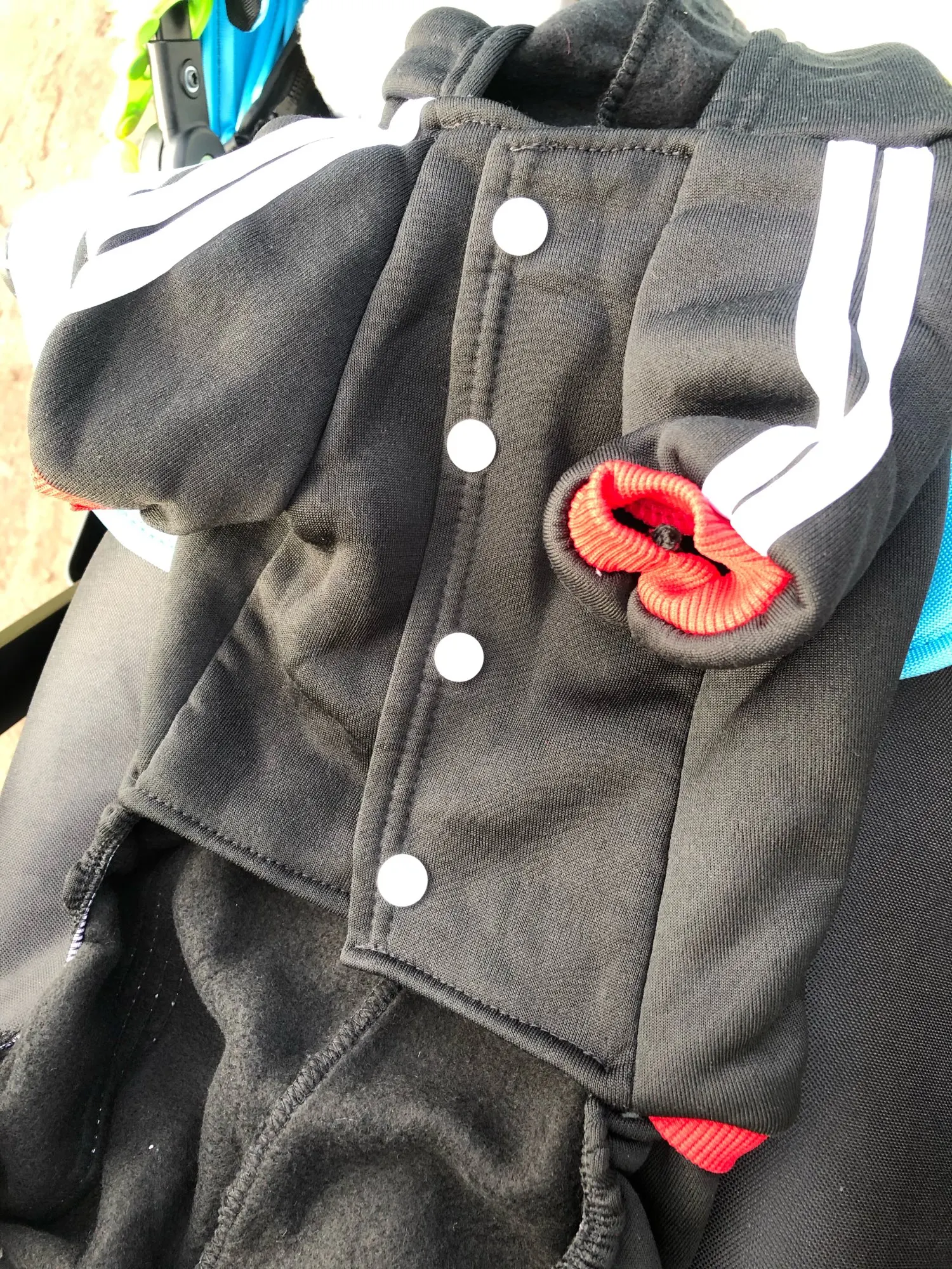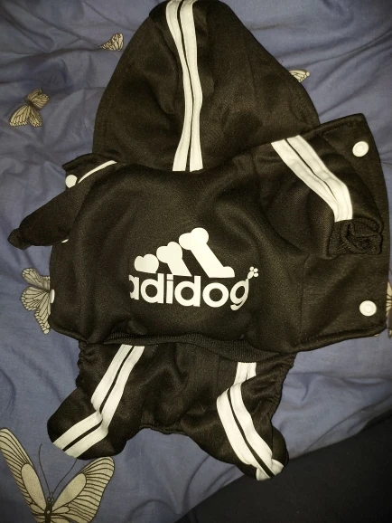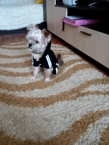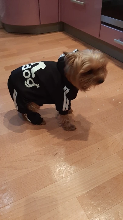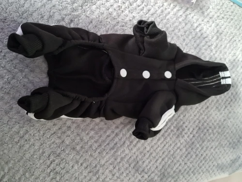 Доставка быстрая. Костюмчик хороший, на кнопках, одевать удобно. Сшит аккуратно, внутри утепленный. Штанишки на манжетах, плотно держатся на ножках. Только капюшон непонятной формы, на голове не держится. Подошёл для йорка 1г 2 мес.