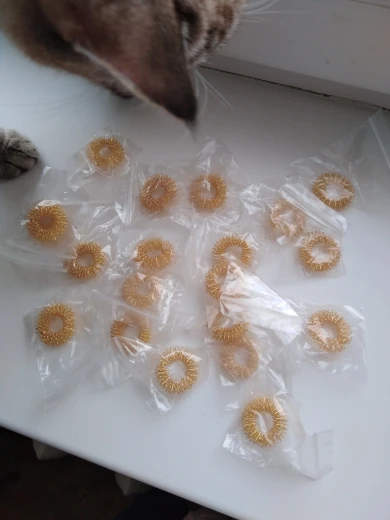 Заказала 19 июля, 5 августа забрала на Укрпочте. Пришло в пакете с пупыркой. Внутри большой зип-лок пакет, а в нем колечки, каждое тоже в своем маленьком пакетике на зип-локе. У меня довольно тонкие пальцы, колечко сидит туговато. У двухлетки спадает, но дочка от массажа кайфует :) Собственно, для этого и покупала, так что всем довольна. с продавцом не общалась