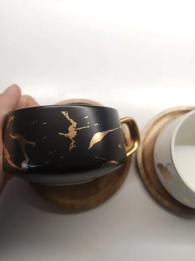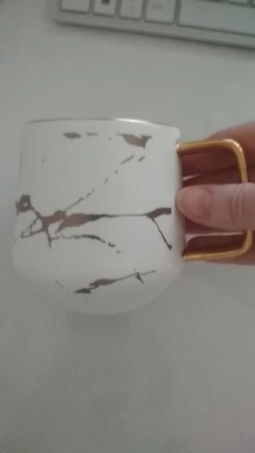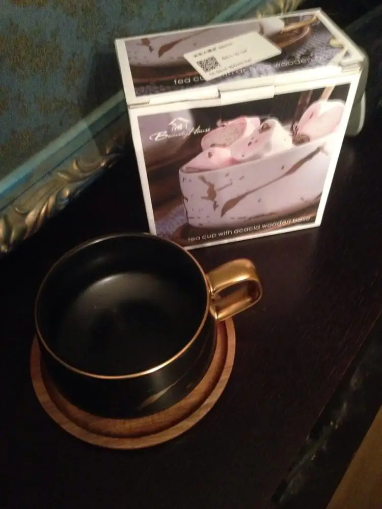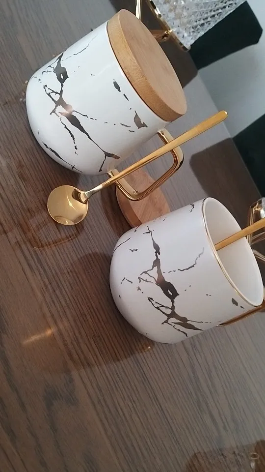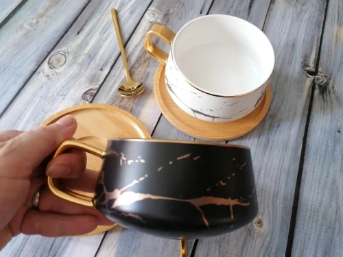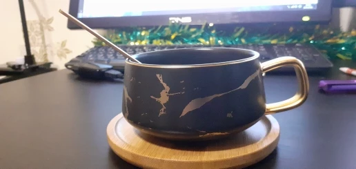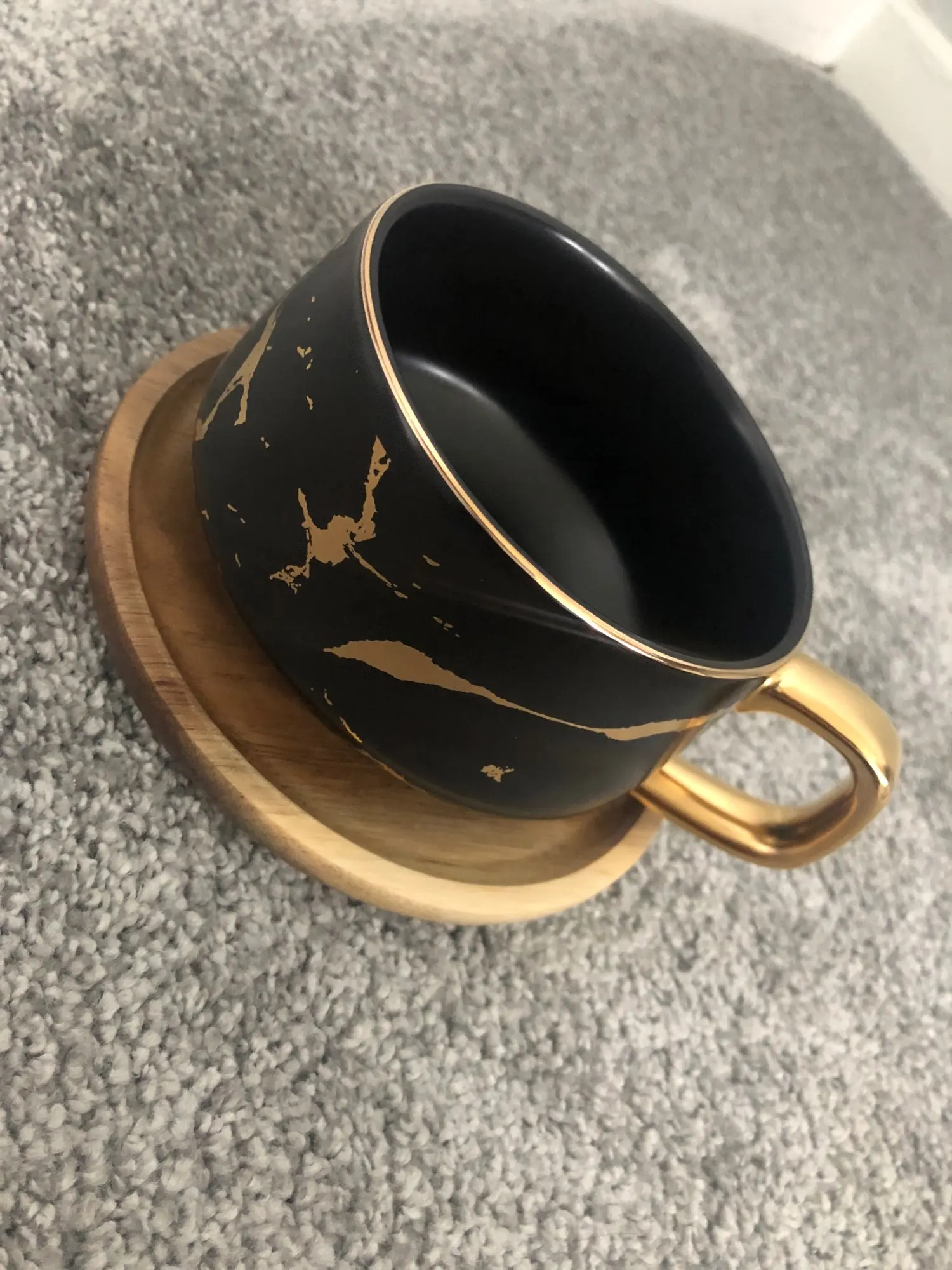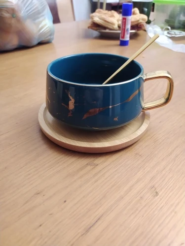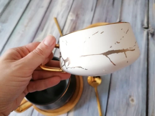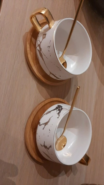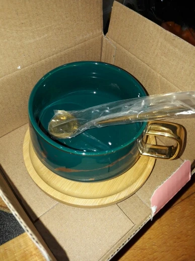 Чашка классная, выглядит отлично. Разводы на чашке не золотого цвета, а бронзовые. Красиво, короче. На ложке косяк - пятно чёрное было, будто капнули чем-то, я потерла его и остался след, видно на фото. Всё остальное мне нравится.