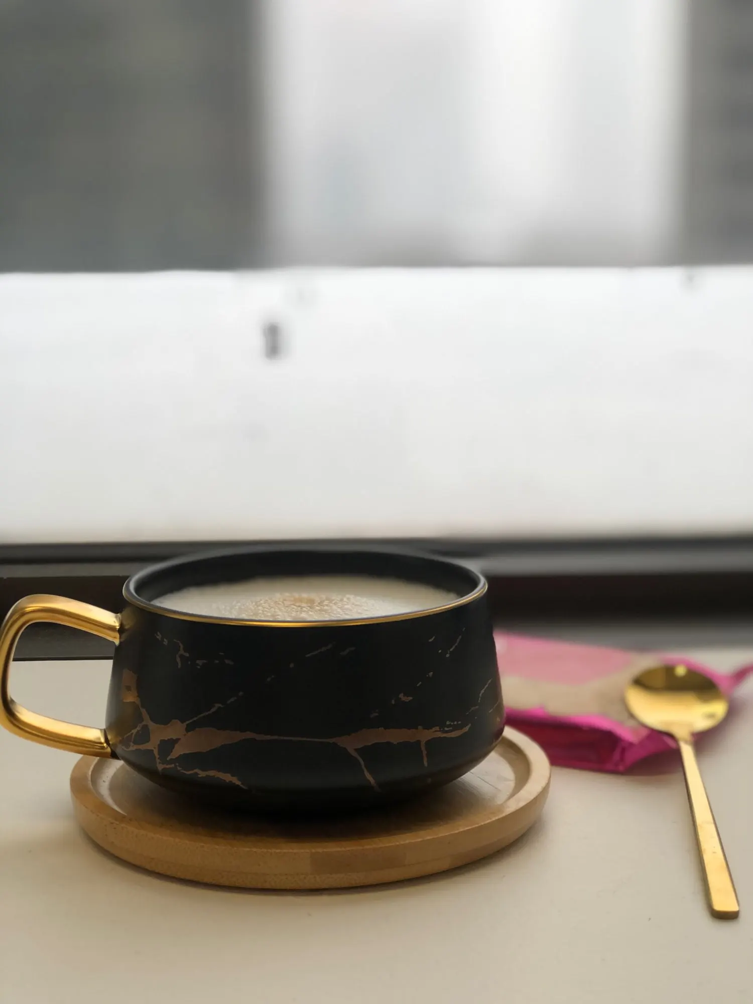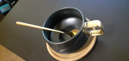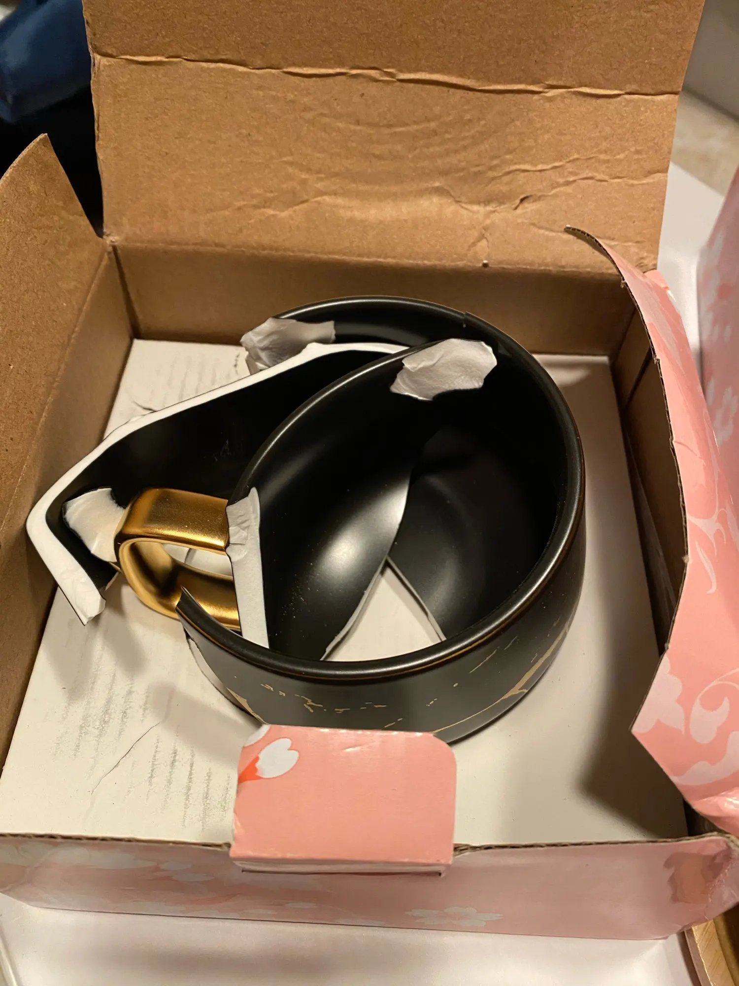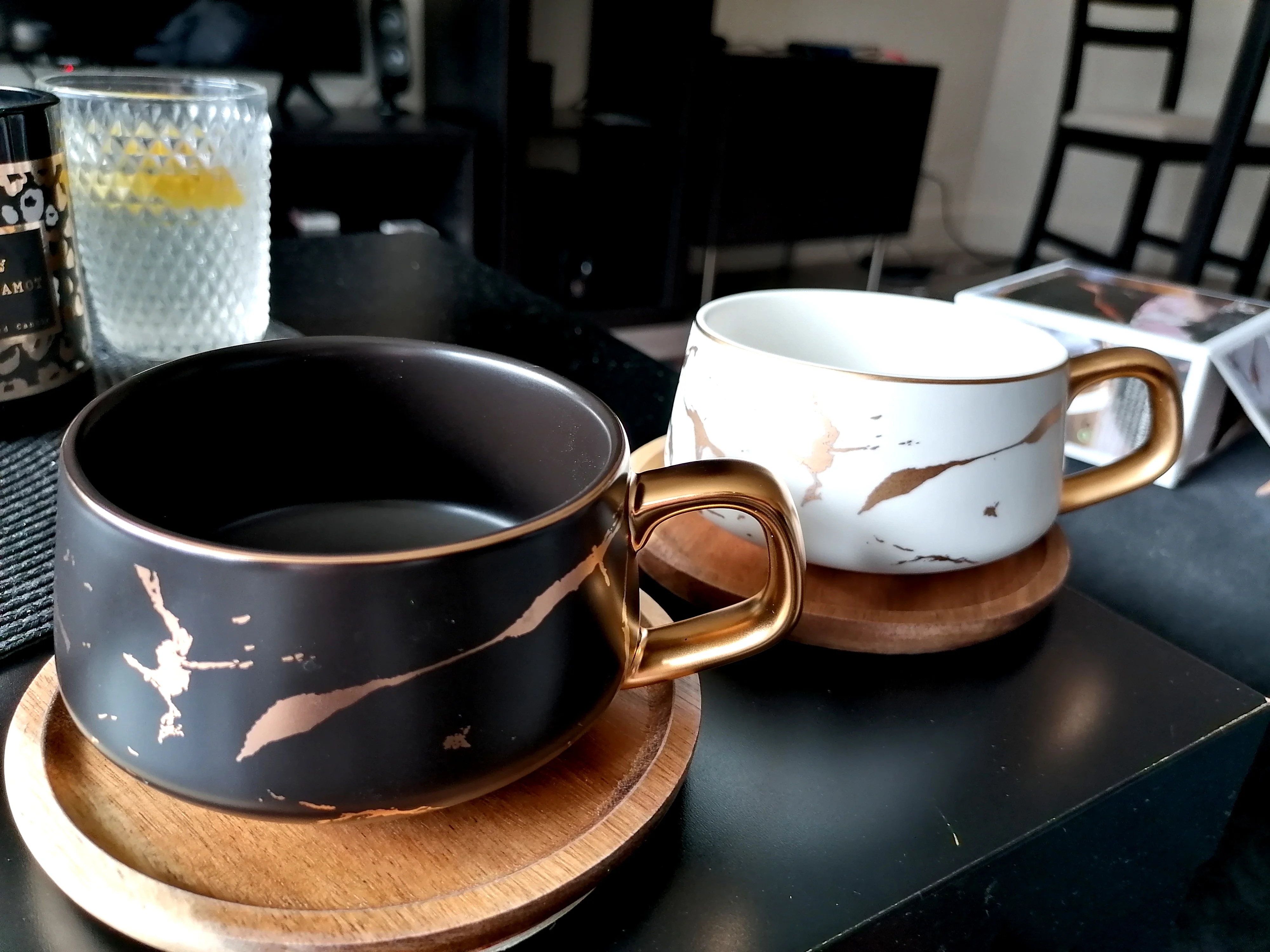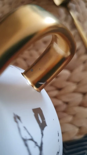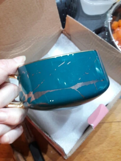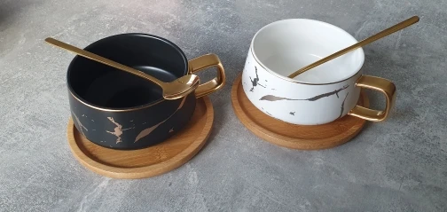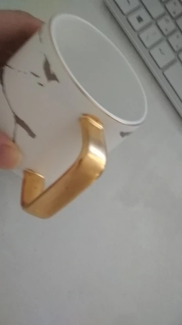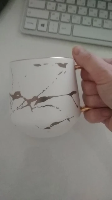 Чашка классная, выглядит отлично. Разводы на чашке не золотого цвета, а бронзовые. Красиво, короче. На ложке косяк - пятно чёрное было, будто капнули чем-то, я потерла его и остался след, видно на фото. Всё остальное мне нравится.