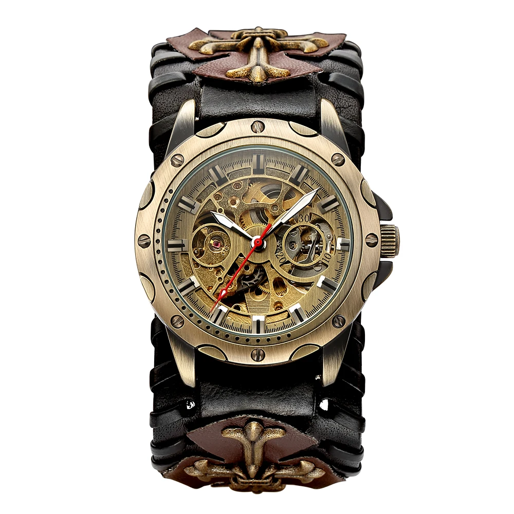 Часы наручные мужские механические, винтажные готические автоматические часы-скелетоны в стиле стимпанк, с автоподзаводом, в винтажном стиле, коричневыйрок