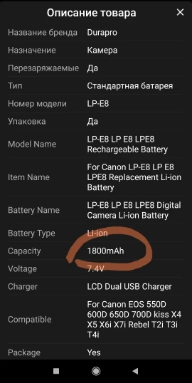 LP-E8 запасная батарея для камер Canon 7,4 V 1800mAh/li-ion Спецификации Батарея: 1. Модель: LP-E8 аккумулятор 2. Емкость: 1800 мАч. 3. Напряжение: 7,4 В. 4. Перезаряжаемый: Да 5. Тип батареи: литий-ионный Особенности: 1. Литий-ионные аккумуляторы премиум класса 2. Высокая плотность энергии, долгий срок службы, без памяти 3. Дополнительная мощность, больше снимков для ваших камер Совместимость: Для цифровой однообъективной зеркальной камеры Canon EOS 550D 600D 650D 700D Для поцелуй X4 X5 X6i X7i Rebel T2i T3i T4i T5i Посылка включает в себя: 1/2/3/4 шт х LP-E8 батареиОпционально 1 шт. x LCD USB двойное зарядное устройство 1 шт. х USB кабель Внимание: -Зарядите аккумулятор перед использованием -Используйте только специальное зарядное устройство -Держите клеммы батареи в чистоте -Всегда храните батарею в сухом месте -Не замыкайте аккумулятор -Не разбирайте аккумулятор -Не подвергайте аккумулятор воздействию высокой температуры